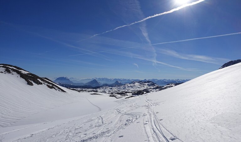 Ski Touren, Freeriden oder Langlaufen über den Bergen Österreichs, mit Fernsicht bis zum slowenischen Triglav-Gebirge – das ist vom Herbst bis in den späten Frühling am Dachstein möglich.