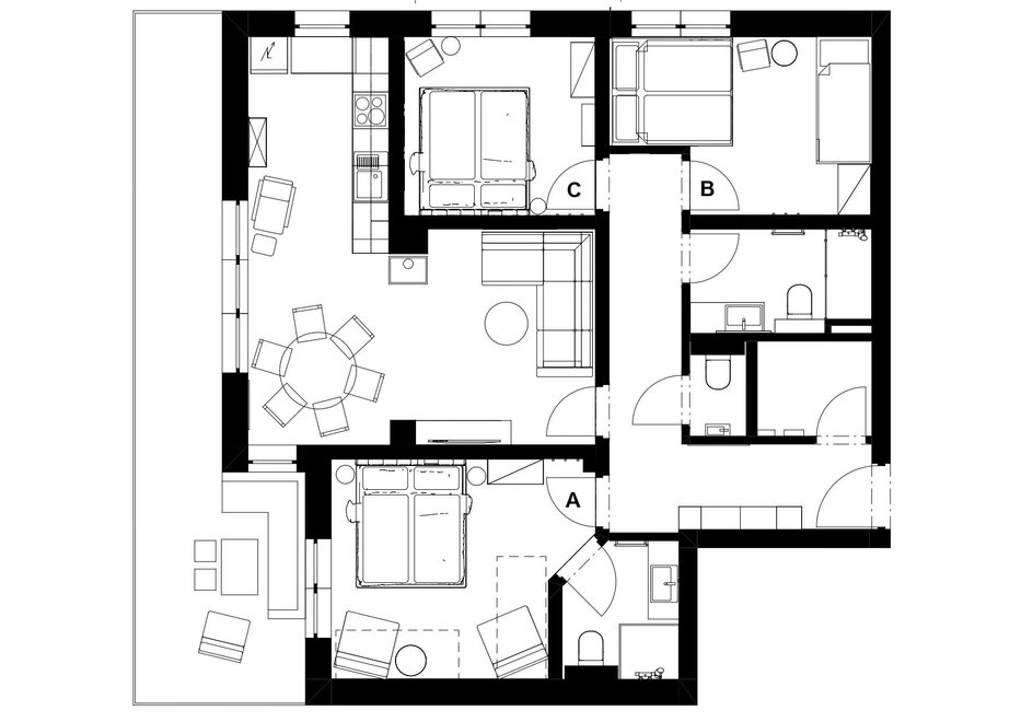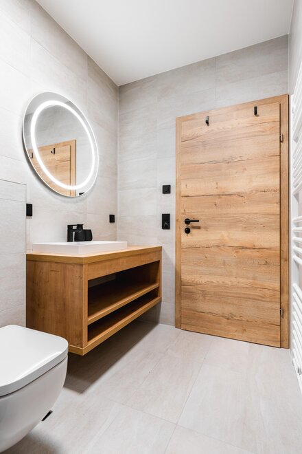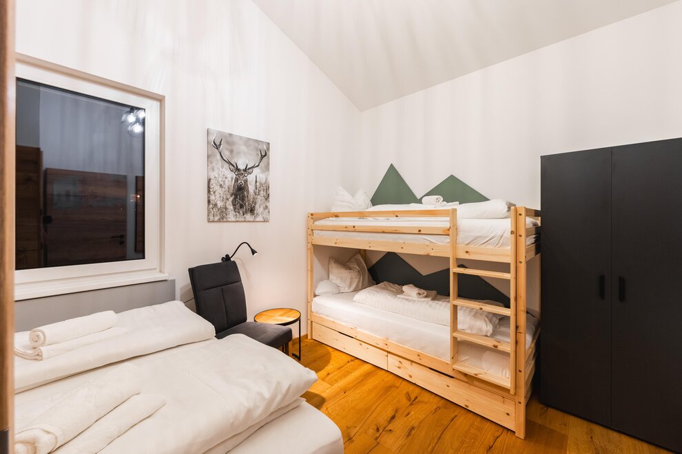 The apartment features a spacious cooking, living, and dining area with a breathtaking view of the surrounding mountains. Three bedrooms offer ample space for restful nights: One of the rooms has a double bed, two pull-out sofas that are perfect for children to sleep on, as well as an en-suite bathroom. Another bedroom is equipped with a double bed and a bunk bed, while the third has another double bed. Additionally, there is a separate bathroom and a total of three WCs, ensuring maximum comfort even with full occupancy.