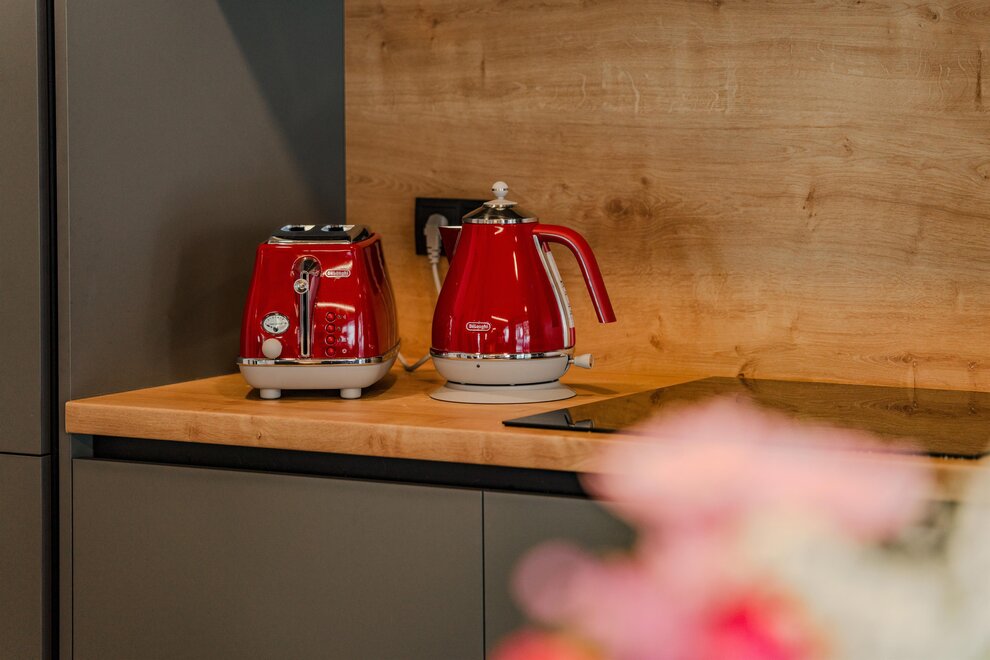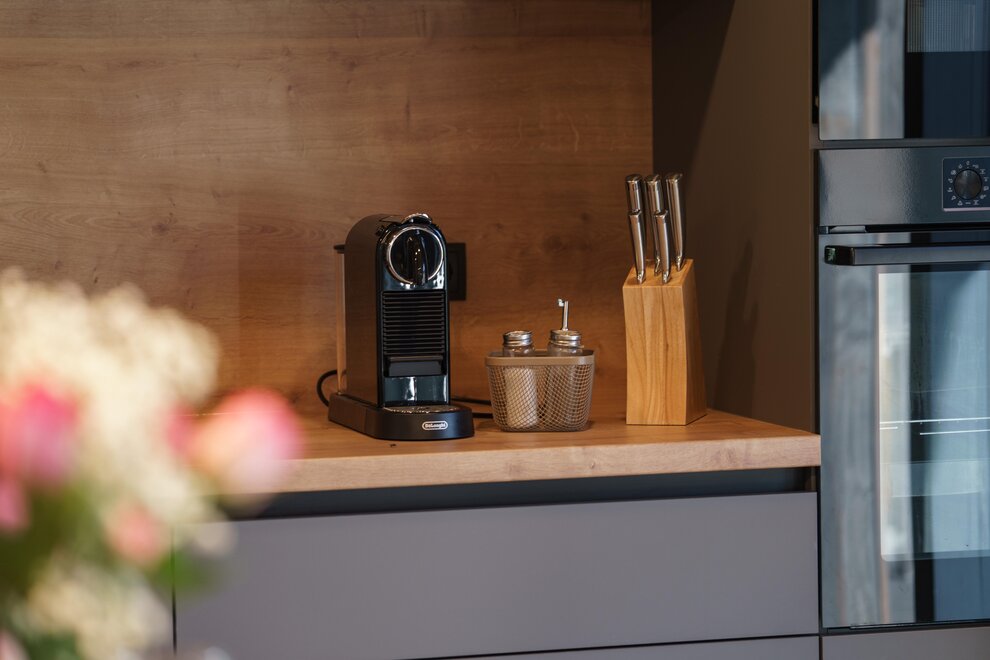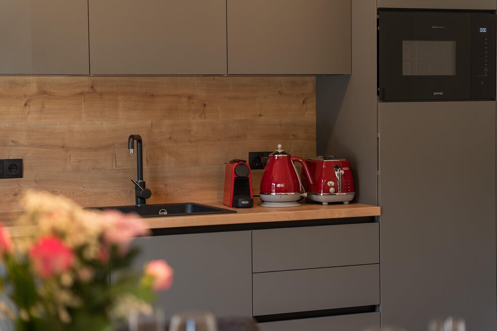 - Open-plan kitchen equipped with: 4-zone ceramic cooktop, Refrigerator with freezer , Dishwasher, Toaster, Kettle, Nespresso capsule machine