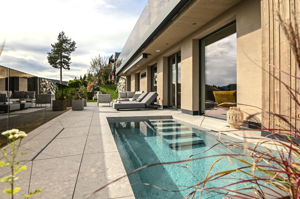 The Alpin Chalet Dachsteinhaus welcomes you in a unique secluded location at 1,400 meters above sea level over Ramsau am Dachstein – directly on ski and hiking trails, surrounded by stunning mountain scenery. The newly expanded premium chalet consists of two exclusive suites and a private panorama spa with sauna, relaxation area, yoga space, and a heated outdoor pool with a distant view. The chalet combines modern architecture with alpine tradition and plenty of natural wood. Each suite features a private lift access, a high-quality kitchen, spacious living areas, and large panoramic windows that bring the mountain world inside.