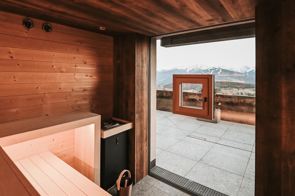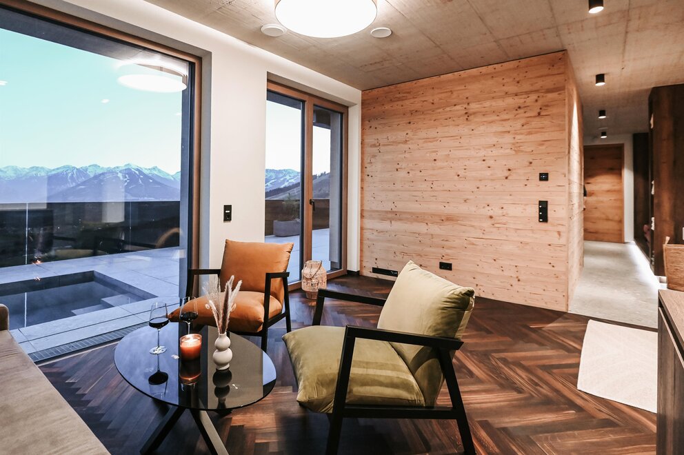The Panorama Suite Herbert delights with an open spatial feel and impressive panoramic views of the Hohe Tauern and the surrounding mountain landscape. Large windows bring nature directly into the suite and create a bright, tranquil atmosphere. A modern fireplace invites cozy evenings, while the stylish living area, separate bedroom, and high-quality bathroom offer the utmost comfort. The suite combines modern alpine design with clear architecture and is ideal for couples or those seeking peace, who appreciate far-reaching views, design, and relaxation.