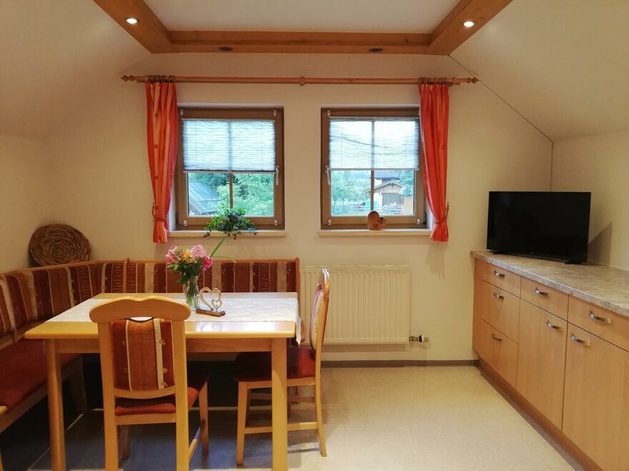 As a special highlight, a barbecue with a cosy sitting area is available in our garden. Whether you want to end the warm summer evening with a good glass or the children are still romping around in the garden, there is always something nice to do. Only a stone's throw away from our apartment Natur Herz, there is a public playground that will make every child's heart beat faster - a little insider tip: at the sign "Naschgarten" simply try what grows there (e. g. strawberries, tomatoes, etc. ) In winter, skiing is of course on everyone's lips in our region. Especially since the eastern first entrance to the Schladming 4-mountain ski area - the Hauser Kaibling - only has 3 cars or minutes away by ski bus. Ski bus stop in walking distance to our house. Winter hikes and horse-drawn sleigh rides can be undertaken from our house. For cross-country skiers we recommend our nordic centre Ramsau am Dachstein (approx. 15 minutes by car).