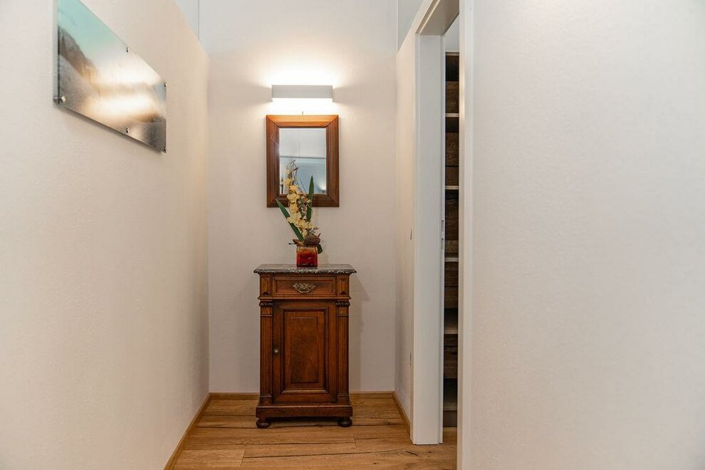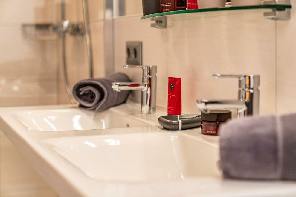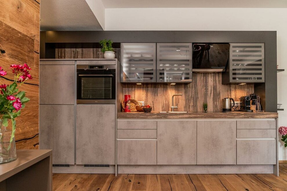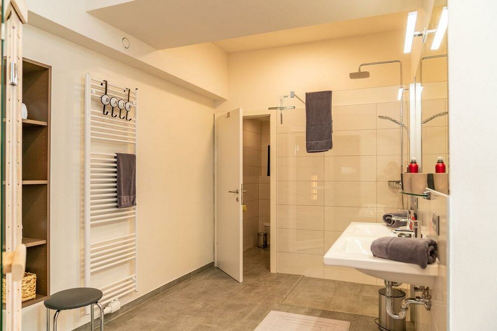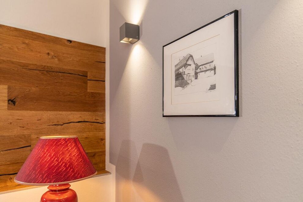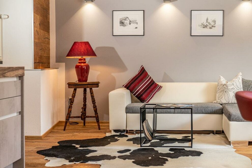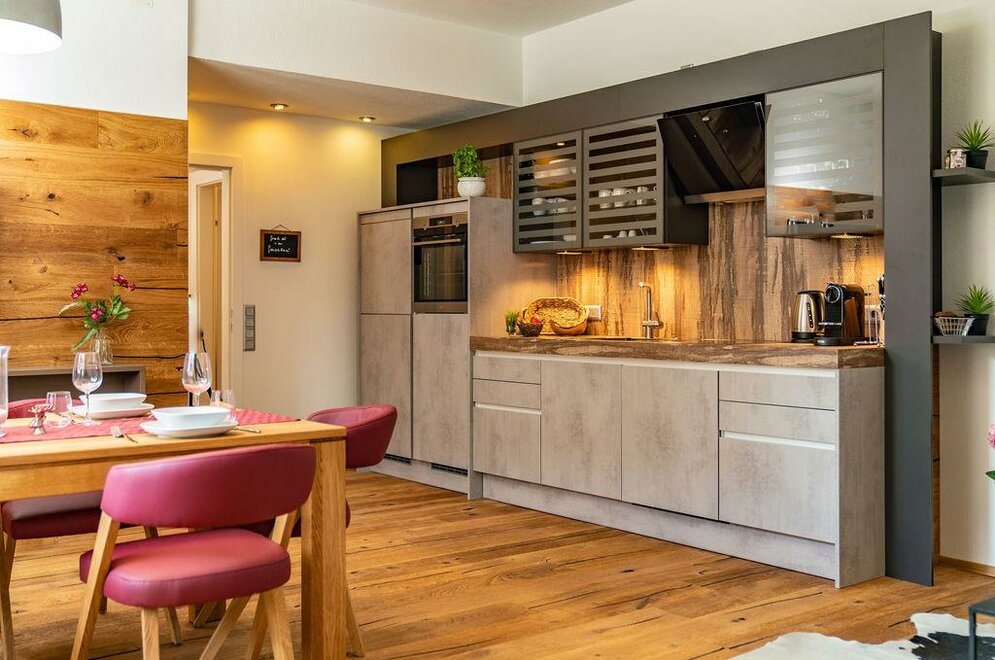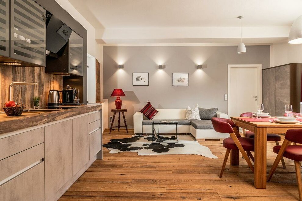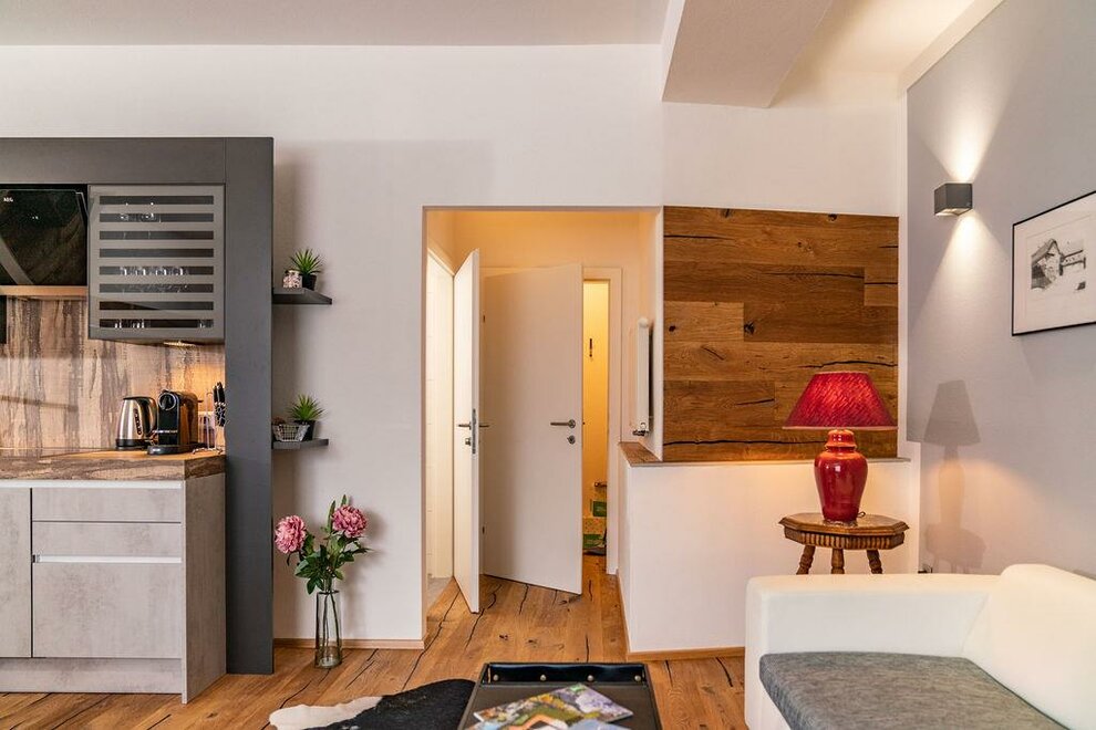Our non-smoking apartment Greisslerei offers on 84 m² space for 2 to 6 persons. In addition to the two bedrooms for 2 persons each, there is a pull-out couch (also for 2 persons) in the living area. The fully equipped kitchen (e.g. coffee machine, refrigerator, dishwasher, toaster, microwave, hand blender, electric kettle, bread cutter, plate grill and much more) leaves nothing to be desired. In the bathroom you will find a hair dryer and a washing machine in addition to the basic equipment. Infrared sauna, free W-Lan, 3 large flat screen TV - holiday comfort with all the conveniences you are used to from home.