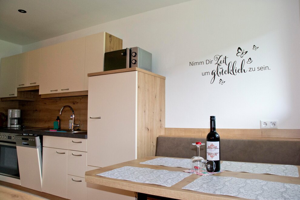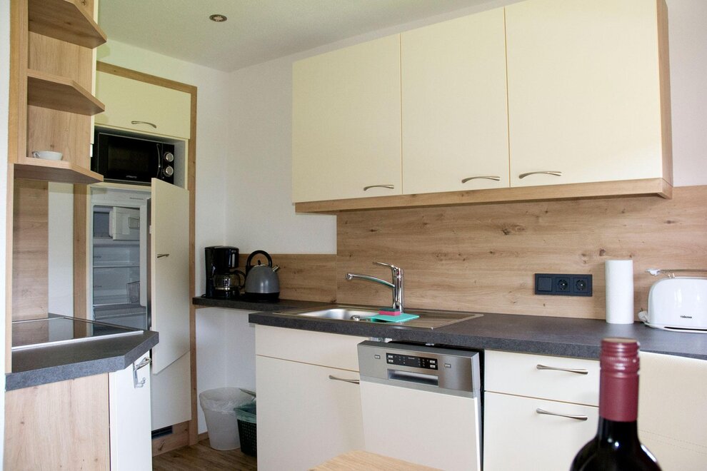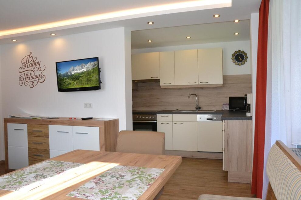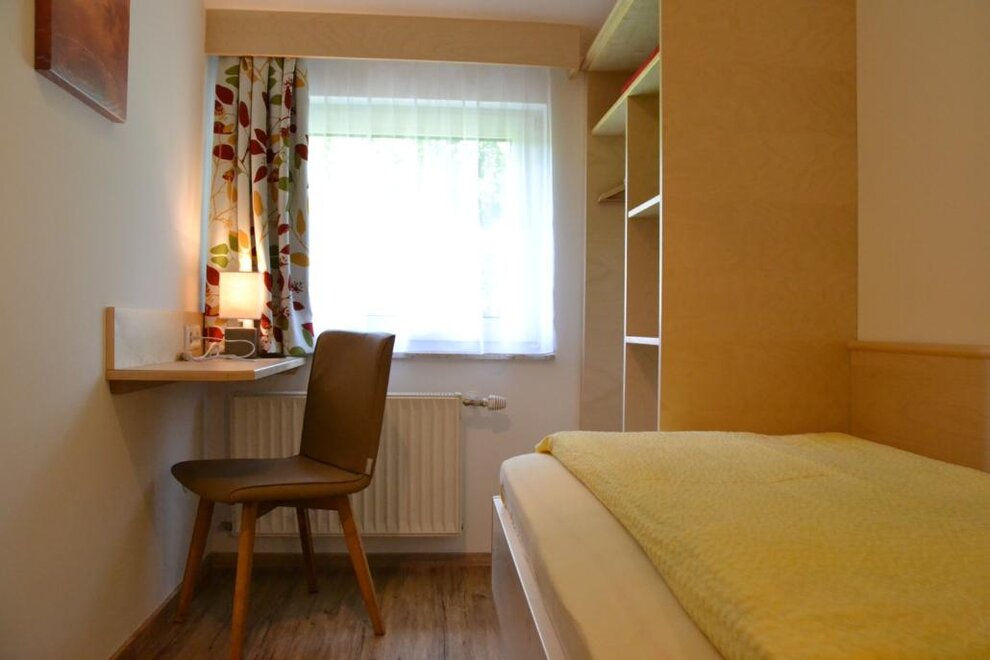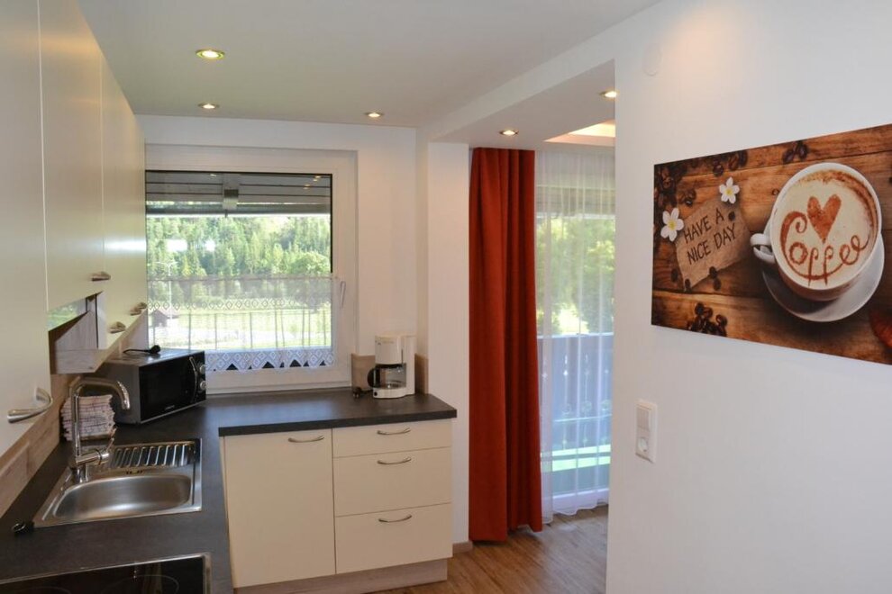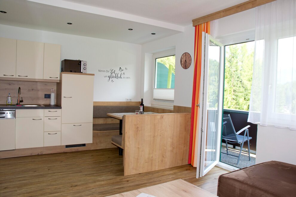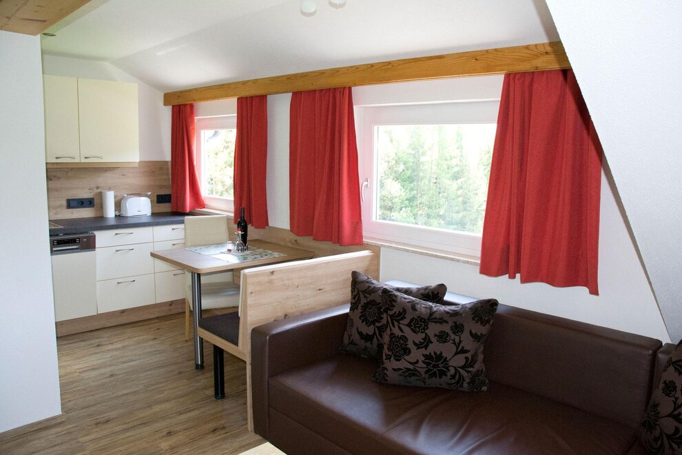 Apartment for 3 people, 1 double room, 1 single room, bathroom with shower, toilet, anteroom, kitchen-living room with satellite TV, WiFi and large balcony to the south and west. The kitchen is equipped with a ceramic hob, oven, microwave, kettle, coffee maker and dishwasher. There is a ski room with waxing facilities on the ground floor. A washing machine and iron are available to all guests.