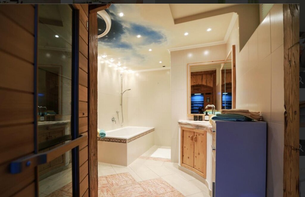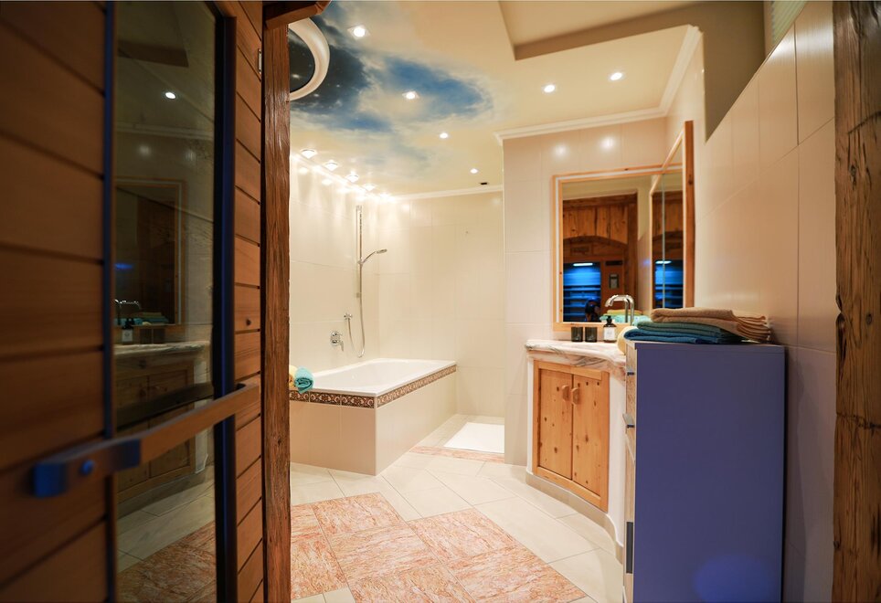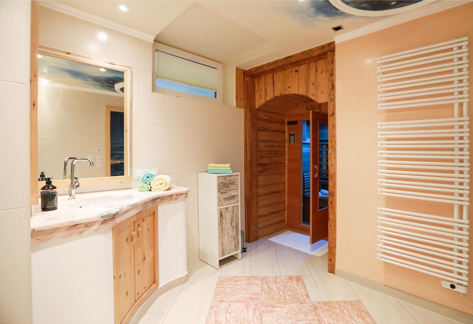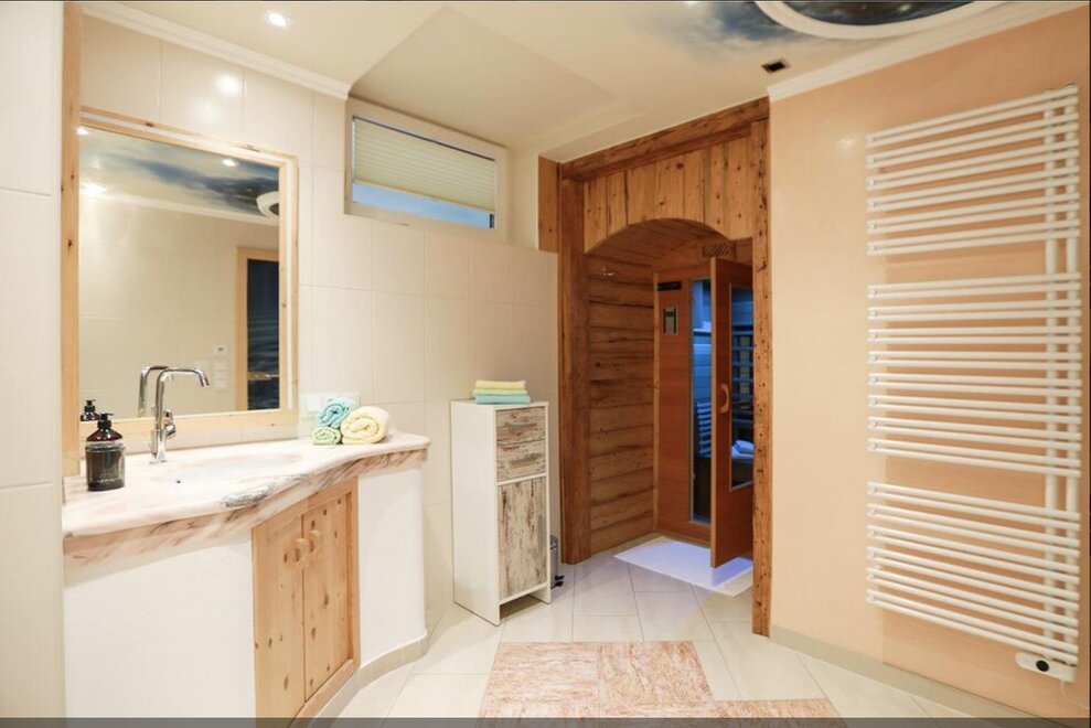 Size 70 qm, relexation is guaranteed in the cheerful bathroom equipped with a rain shower, bathtub, handmade marble sink, music, infrared cabin, heated floors, hairdryer, towel dryer and separate toilet
