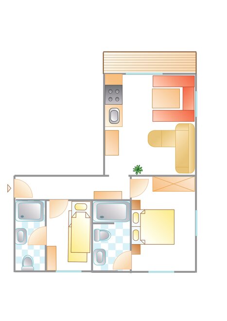 The Apartment (55m²) is composed of a bed room, a separate room with bunk bed and ensuite bathroom, living room with an extendible Couch, shower/WC, anterroom, completly arranged kitchenette, oven, microwave, dish washer, phone, fridge, TV, balcony.