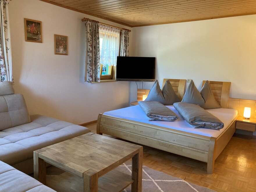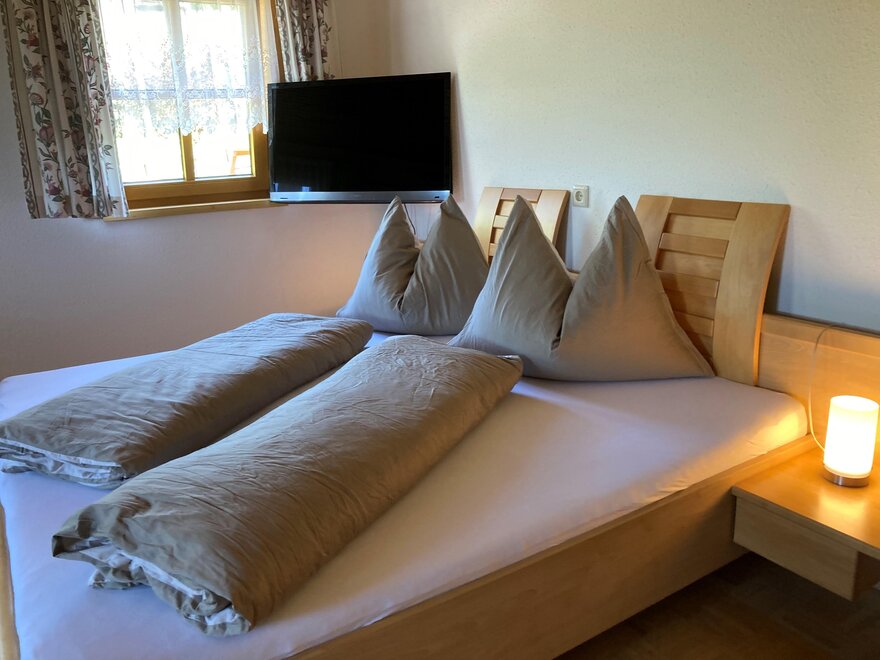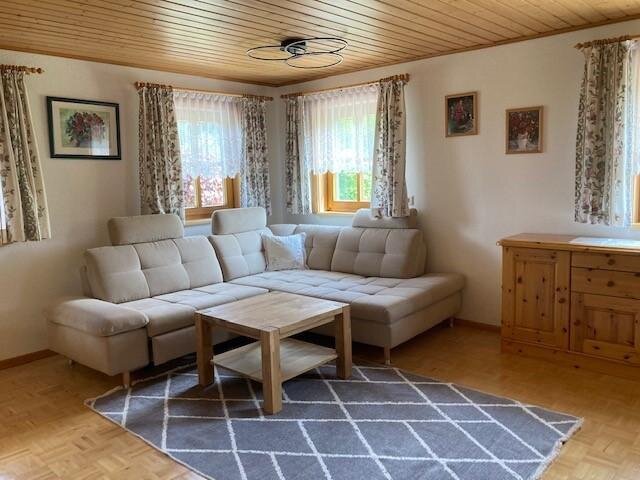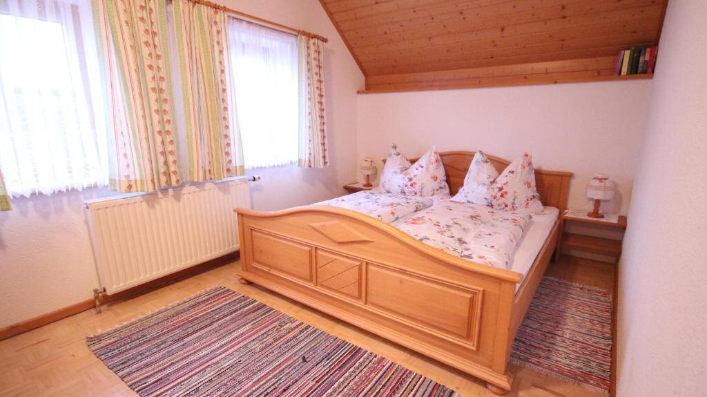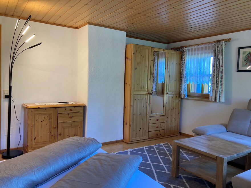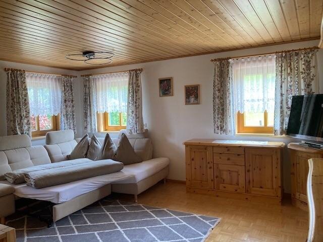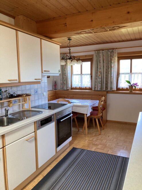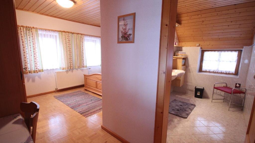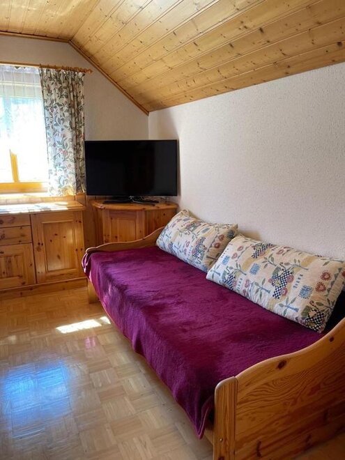 The cozy 75m² apartment TOP2 is on the first floor and can accommodate 2-5 people. The apartment, furnished with lots of wood, has a bedroom with a double bed, a bedroom with a double bed and a single bed, a bathroom with a shower and toilet, and a large kitchen with a dining area. The kitchen is fully equipped. Dishwashing tabs, washing-up liquid, hand and bath towels and toilet paper are also available. The apartment has its own entrance. If you have booked both apartments, they are connected with a door in the anteroom. The balcony offers a wonderful view of the mountains and the great outdoors.