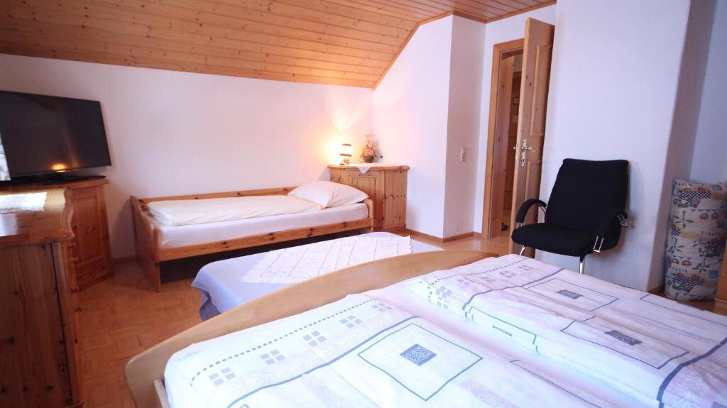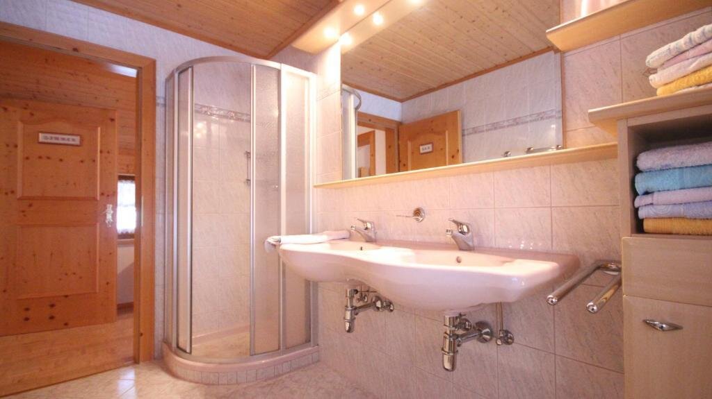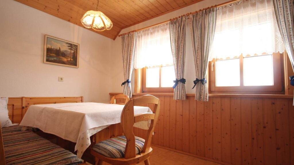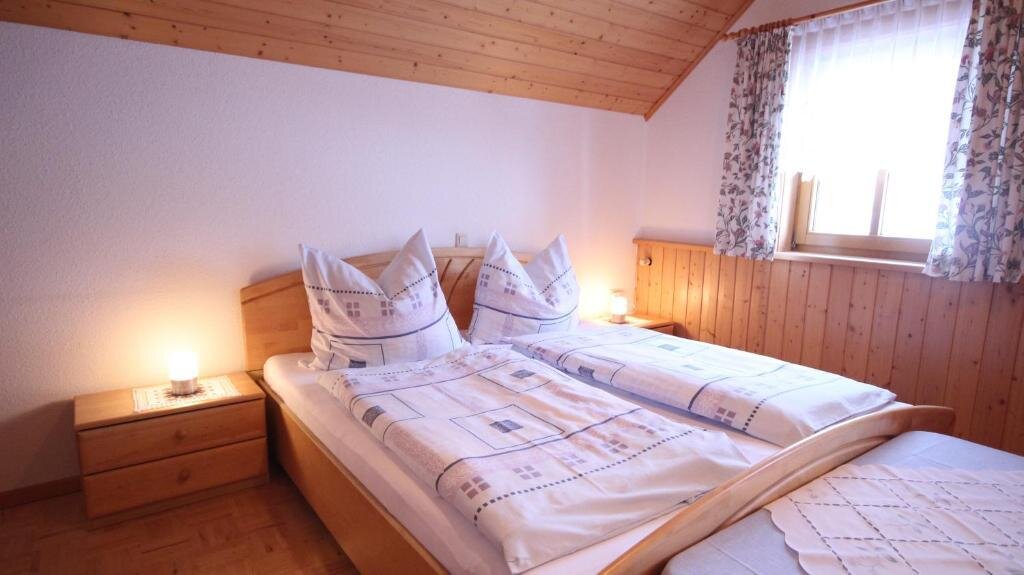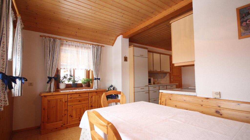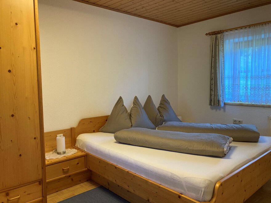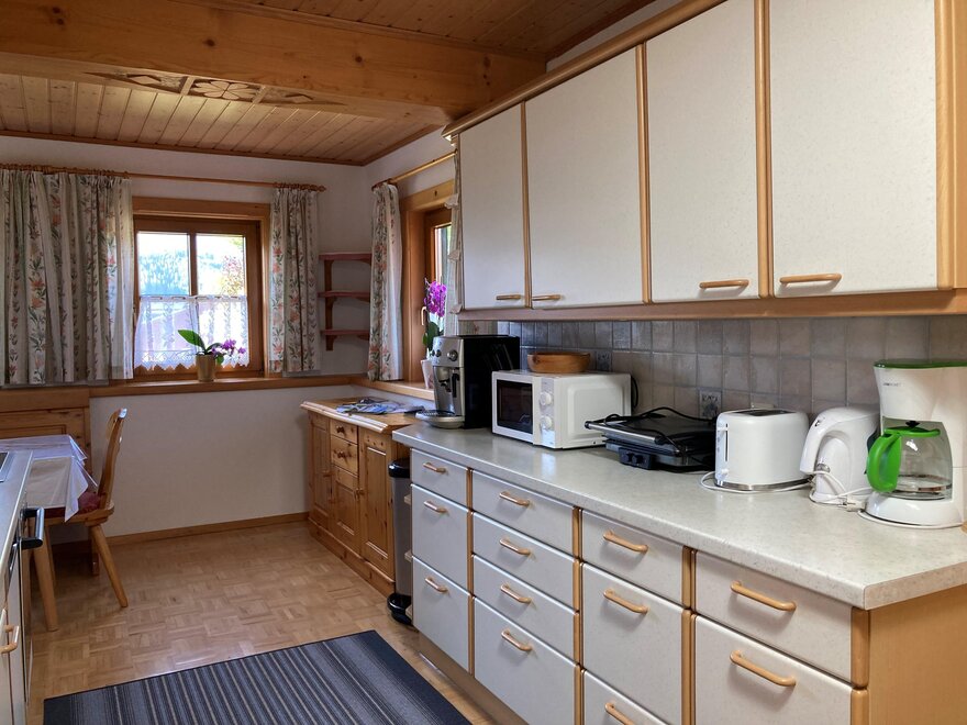 The cozy 75m² apartment TOP2 is on the first floor and can accommodate 2-5 people. The apartment, furnished with lots of wood, has a bedroom with a double bed, a bedroom with a double bed and a single bed, a bathroom with a shower and toilet, and a large kitchen with a dining area. The kitchen is fully equipped. Dishwashing tabs, washing-up liquid, hand and bath towels and toilet paper are also available. The apartment has its own entrance. If you have booked both apartments, they are connected with a door in the anteroom. The balcony offers a wonderful view of the mountains and the great outdoors.