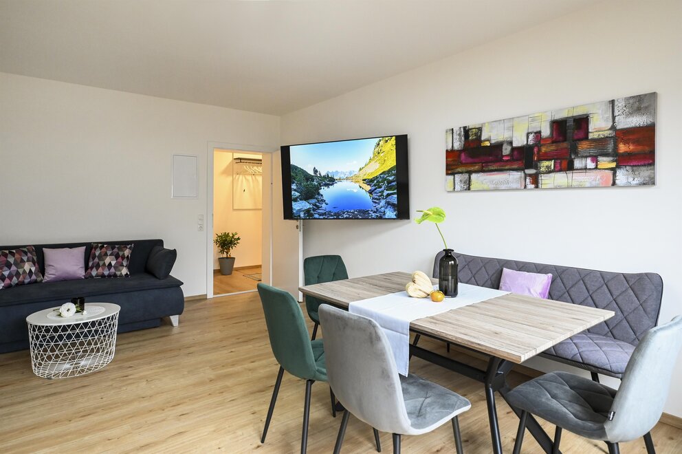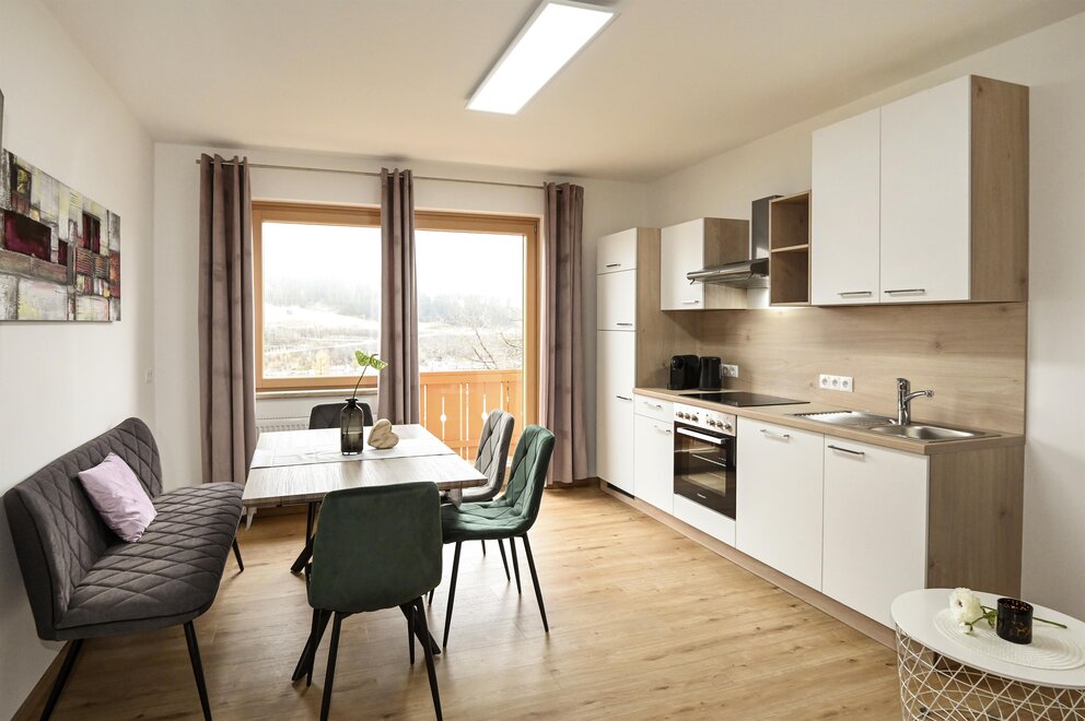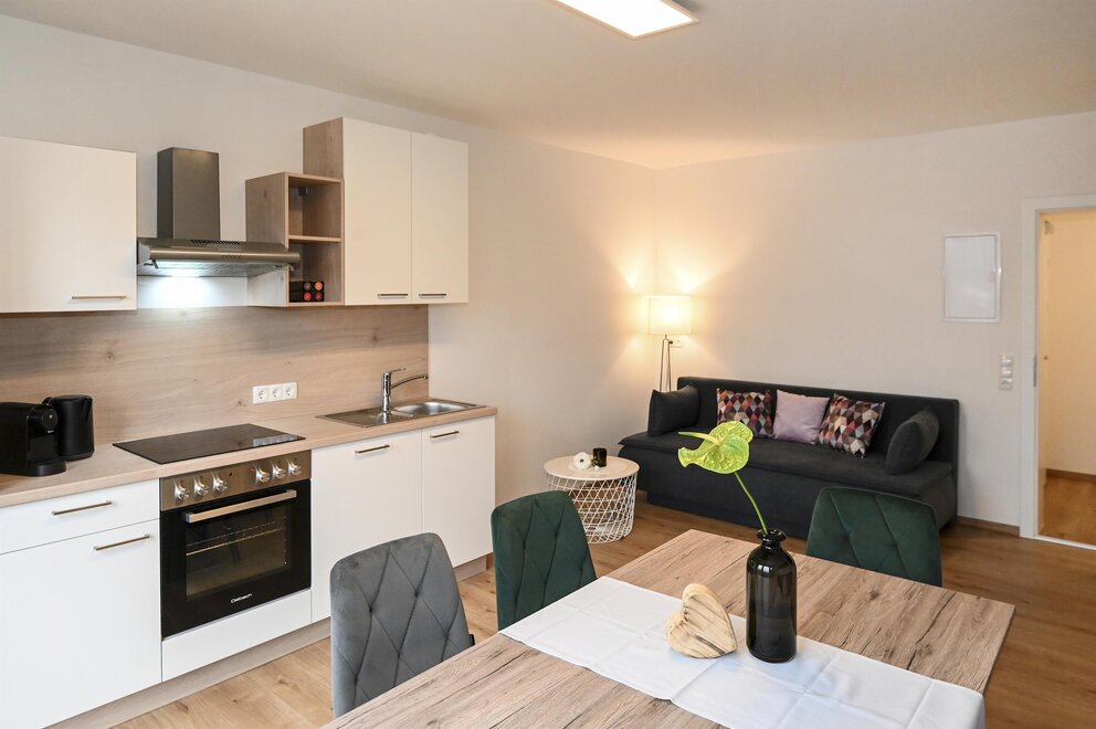 Fully equipped kitchen with living area, pull-out sofa bed, dining table and access to the balcony.
