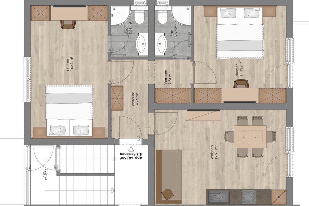 Size 64 m² Occupancy 1 - 4 adults , 0 - 2 children Rooms 3 Bedrooms 2 Room details