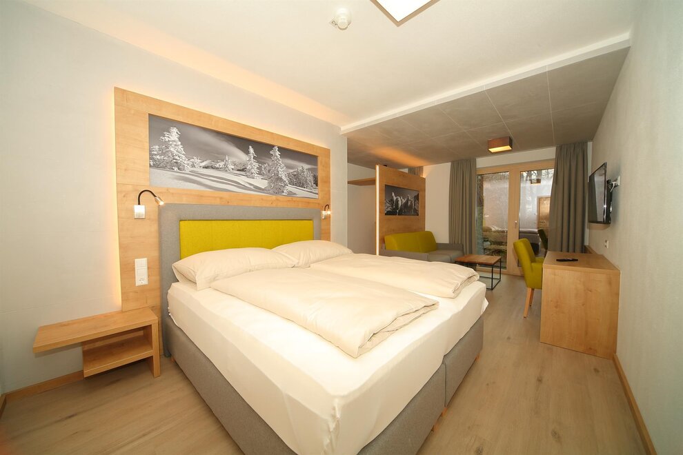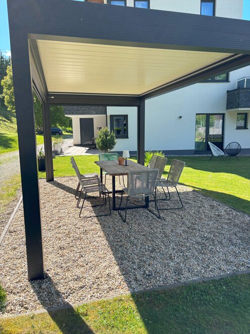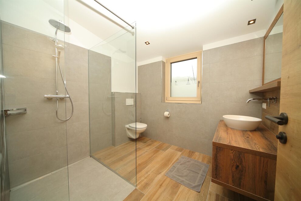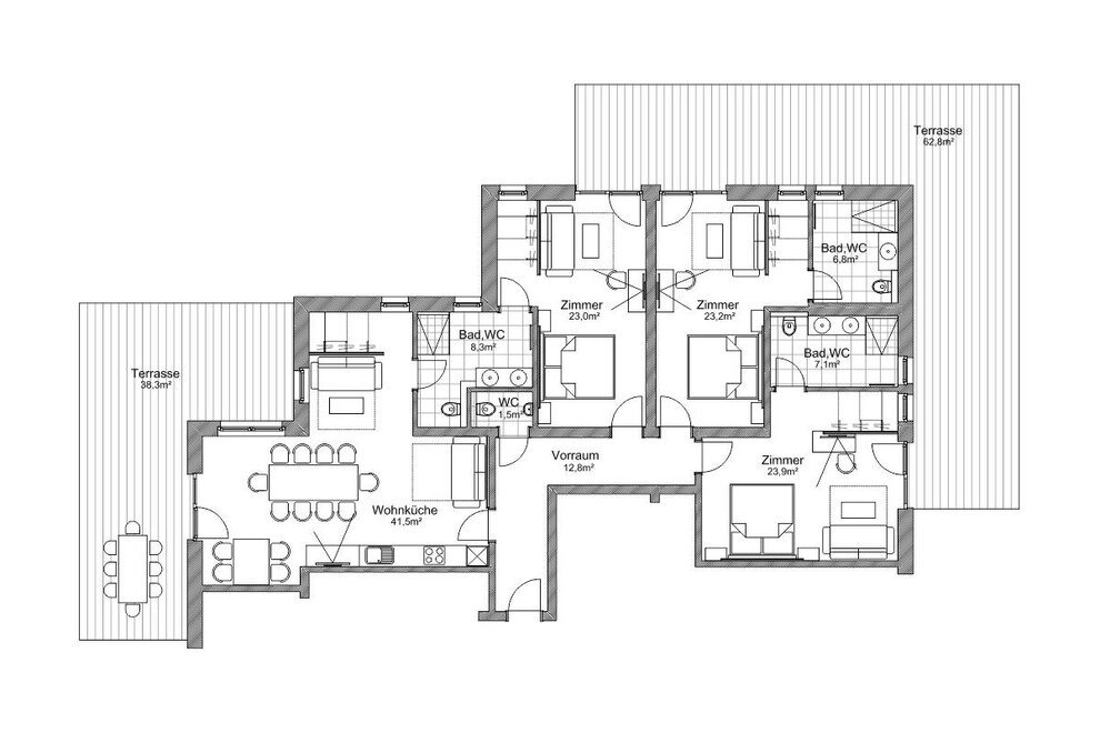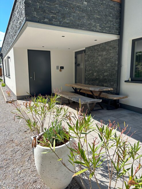 Apartment Ignaz - This holiday flat on the ground floor of our apartment house is suitable for 6 to 16 people. The entrance hall leads to the kitchen-cum-living room with a large dining table and two pull-out sofas and to the three bedrooms, each with a double bed and a pull-out sofa bed. Each of the bedrooms has a bathroom with shower and WC, as well as a separate WC and two large terraces