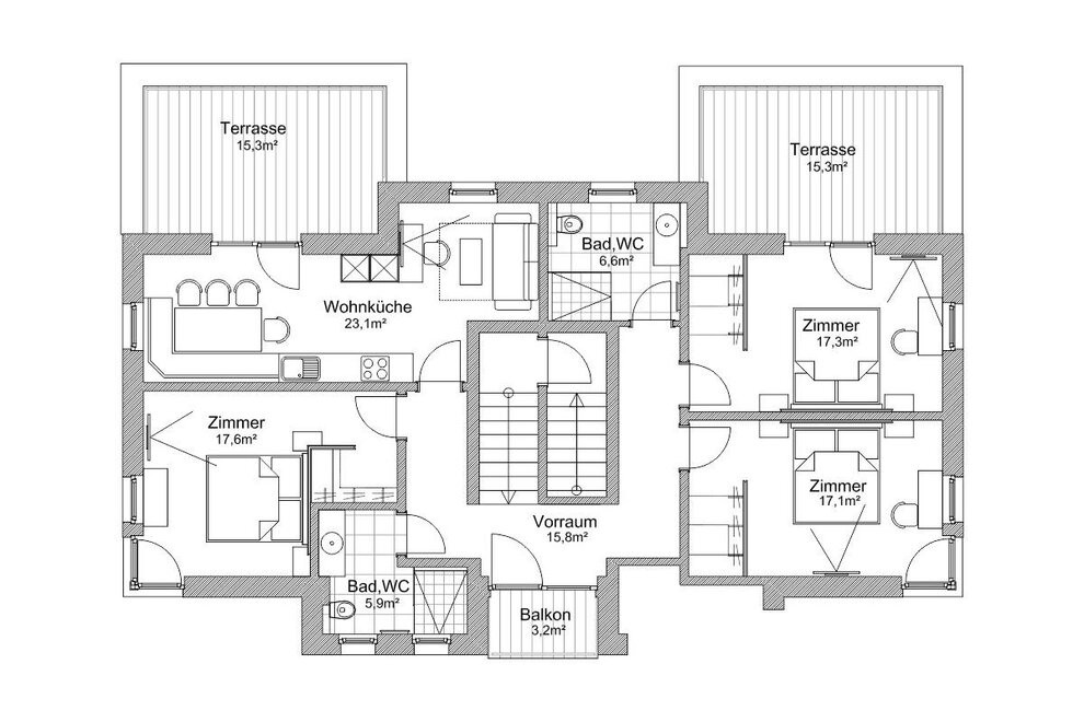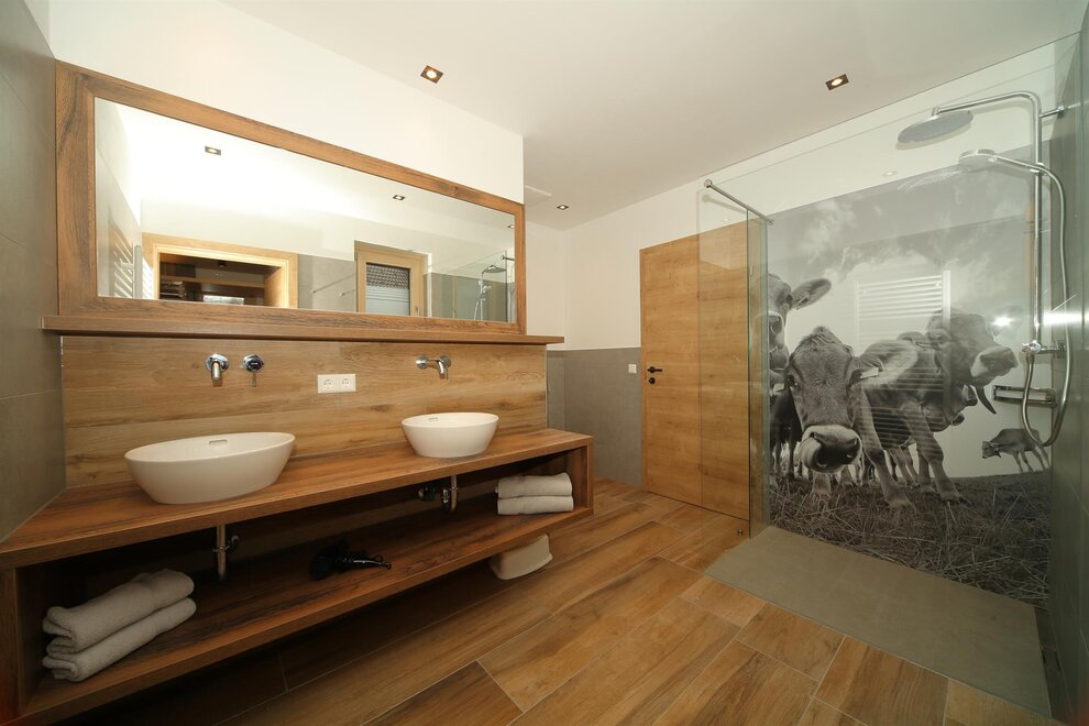 Apartment Xaver - This holiday flat on the top floor of our apartment house is suitable for 4 to 8 people. The entrance hall leads to the kitchen/living room with dining table and sofa bed and the three bedrooms with double beds. This apartment also has two bathrooms with shower and WC, two terraces and a balcony