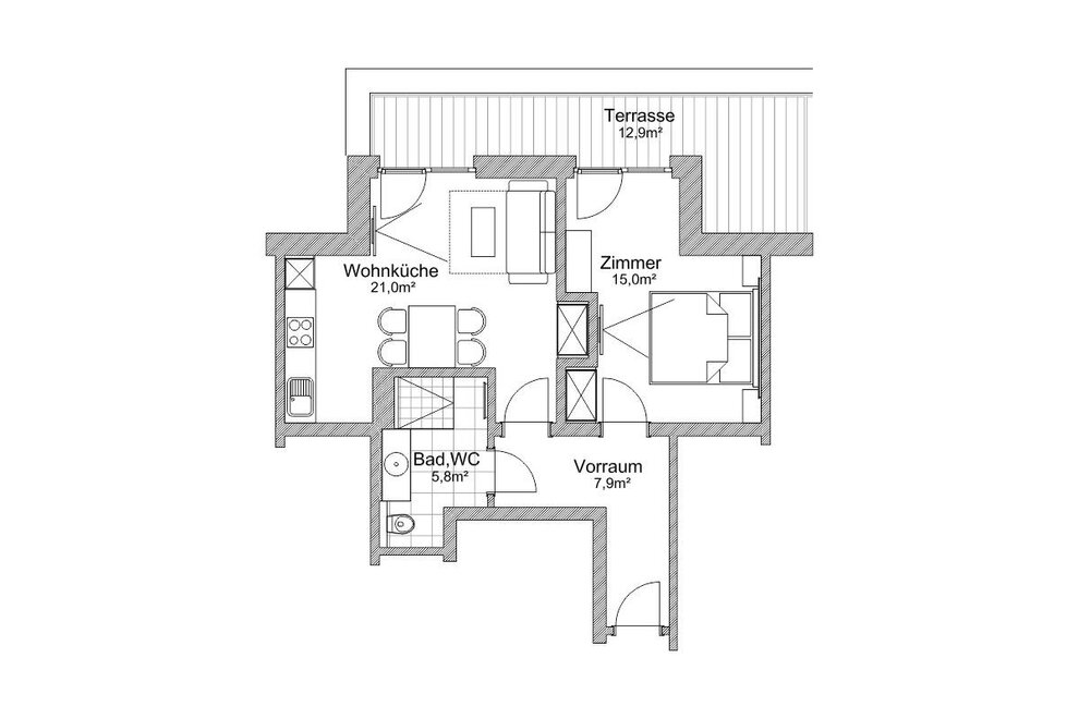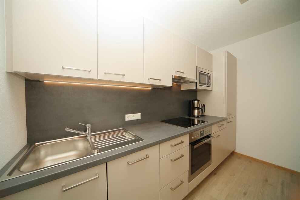 Apartment Lini - This holiday flat on the upper floor of our apartment house is suitable for 2 to 4 people. The entrance hall leads into the kitchen/living room with dining table and pull-out couch and into the bedroom with double bed. This flat also has a separate WC, a bathroom with shower and WC and a terrace.
