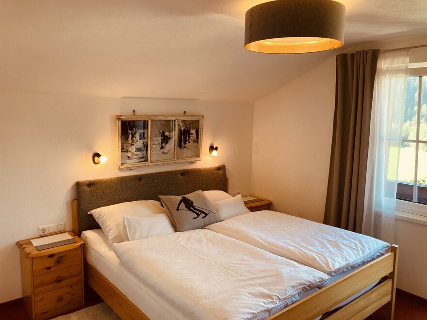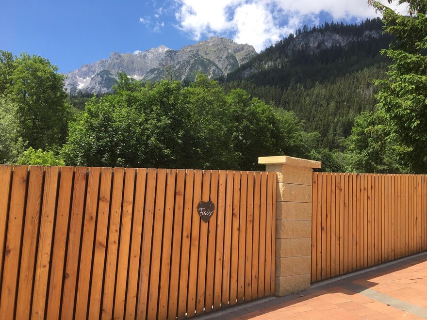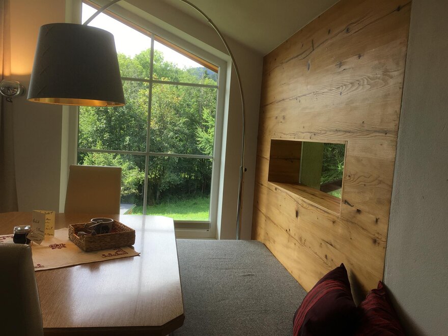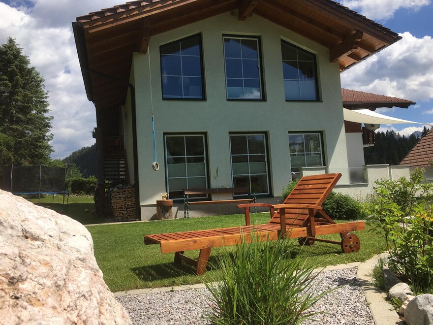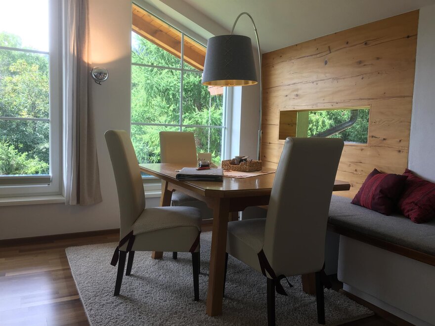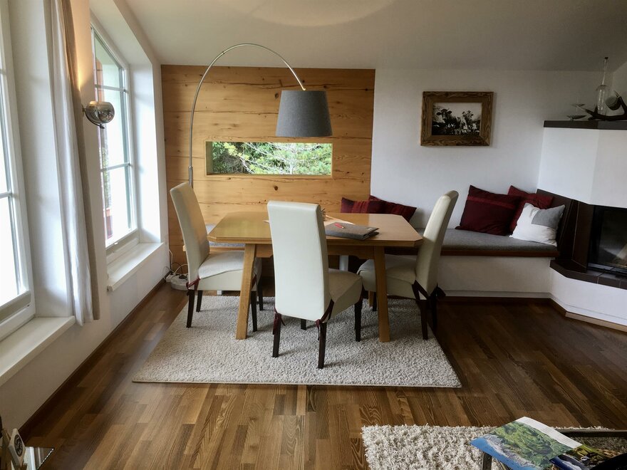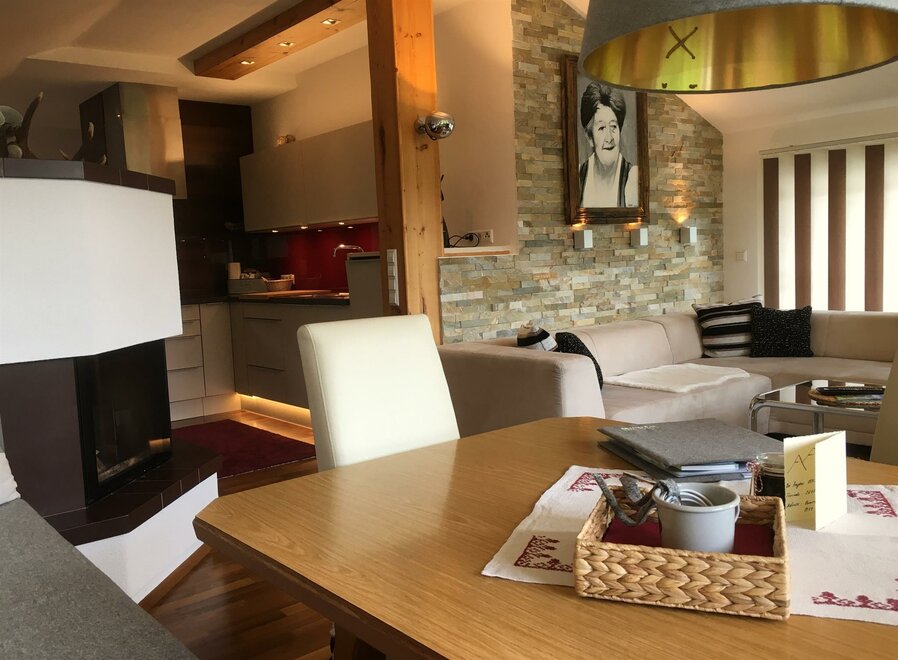 The lovingly furnished apartment Finis is located on the 1st floor. The first floor of a detached house, captivates by the generous space offer with nearly 90 m² and offers place for up to 3 persons. A bright, open living area with fully equipped kitchen, dining table, cosy living room with tiled stove and comfortable living area with large windows and a separate entrance to the garden allow a wonderful view of the mountain massif. 1 bedroom with dressing room, bathroom with shower/WC as well as anteroom are at the guests'; disposal. In addition, the apartment has a separate entrance, its own parking space and ski and bikestoreroom.