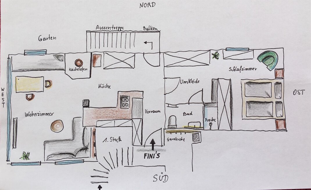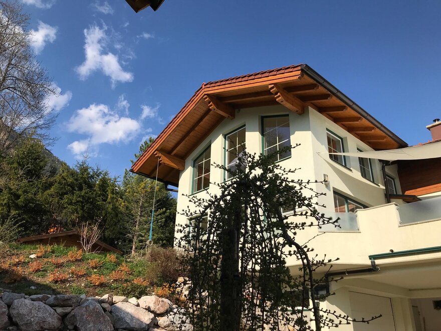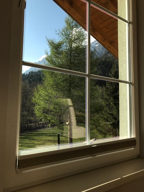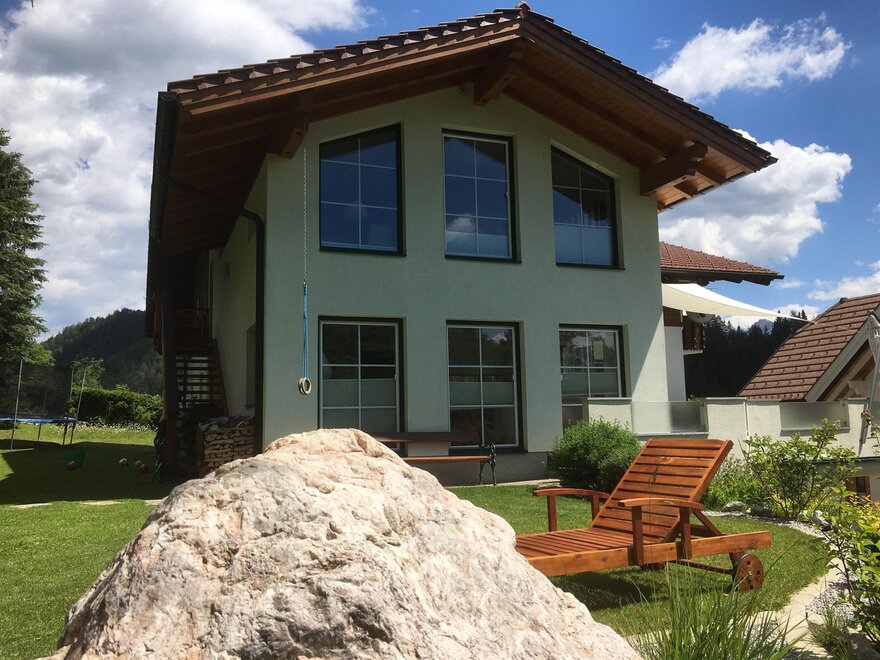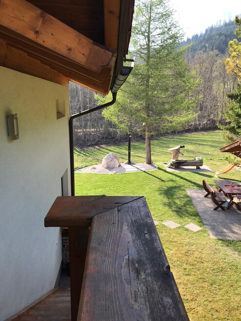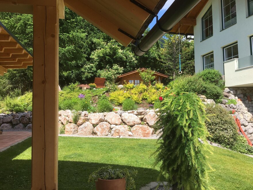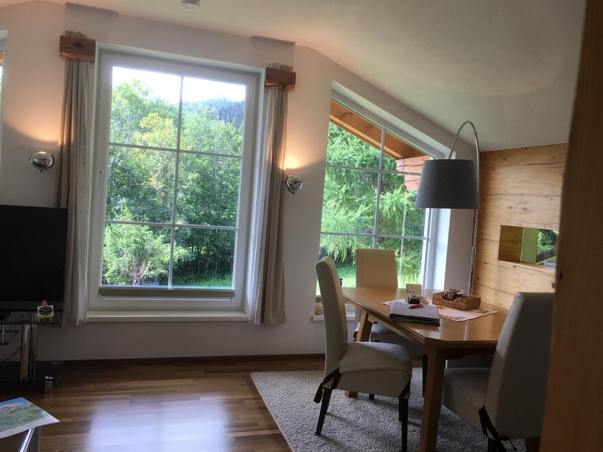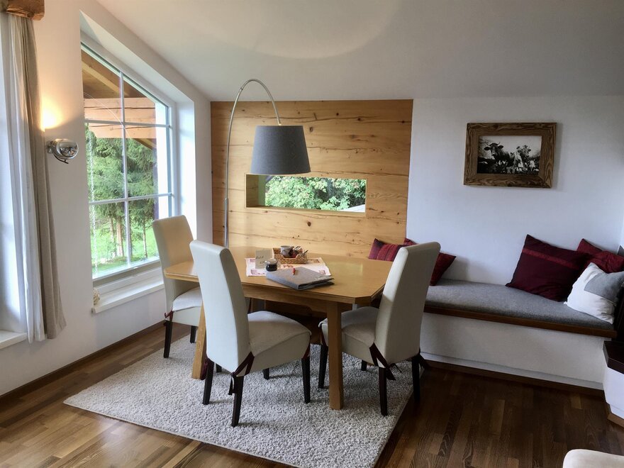 The lovingly furnished apartment Finis is located on the 1st floor. The first floor of a detached house, captivates by the generous space offer with nearly 90 m² and offers place for up to 3 persons. A bright, open living area with fully equipped kitchen, dining table, cosy living room with tiled stove and comfortable living area with large windows and a separate entrance to the garden allow a wonderful view of the mountain massif. 1 bedroom with dressing room, bathroom with shower/WC as well as anteroom are at the guests'; disposal. In addition, the apartment has a separate entrance, its own parking space and ski and bikestoreroom.