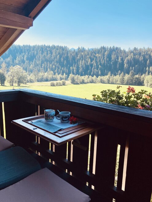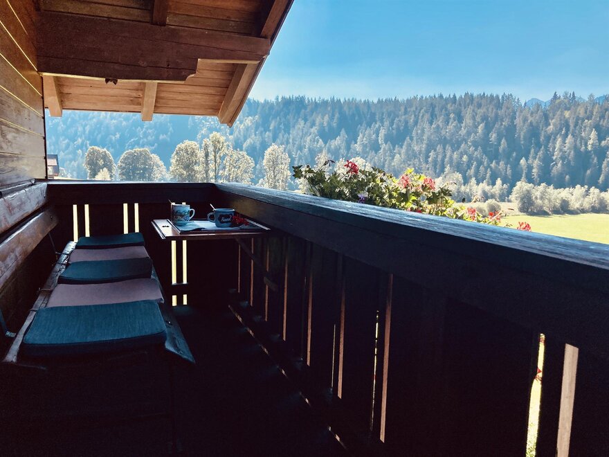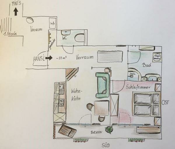 The somewhat smaller apartment Hansl offers approx. 55m2 for 2 people, is also on the 1st floor of our house and has a bedroom, a kitchen-livingroom, a bathroom, an anteroom and an extra toilet. The southfacing balcony invites you to start your day outdoors with a leisurely breakfast. The apartment Hansl also has a separate entrance, private parking as well as a ski- or bikestoreroom.