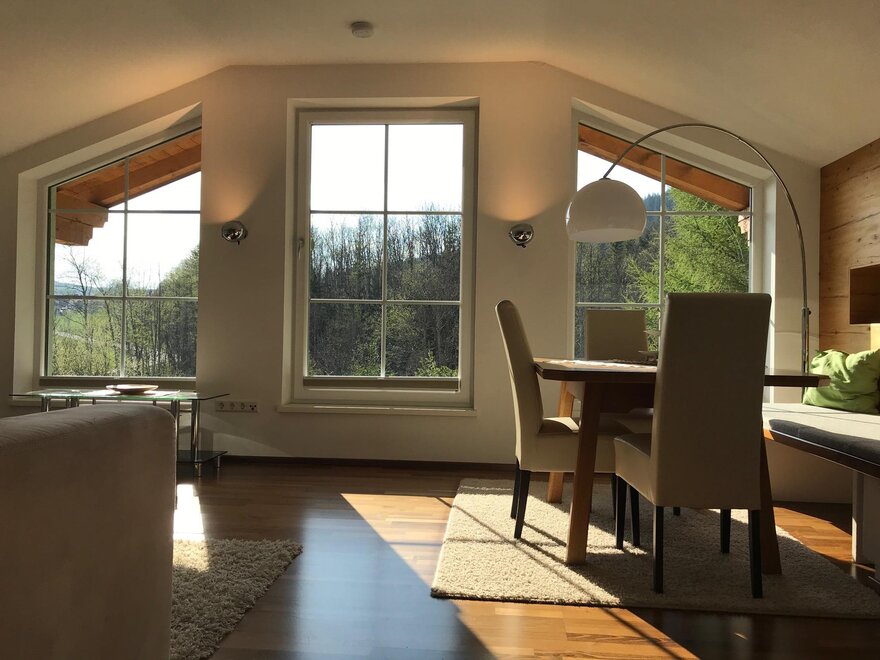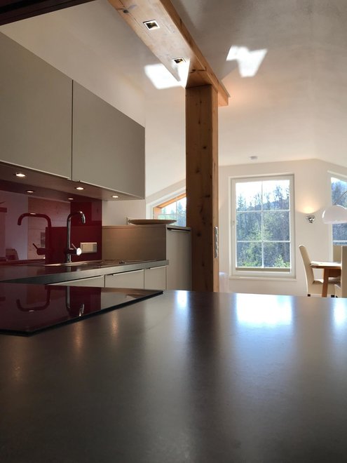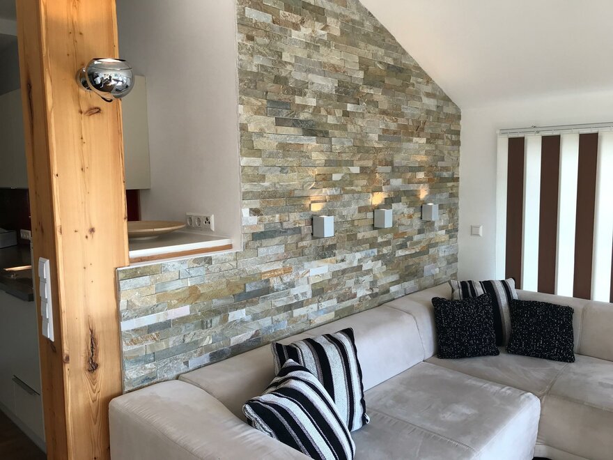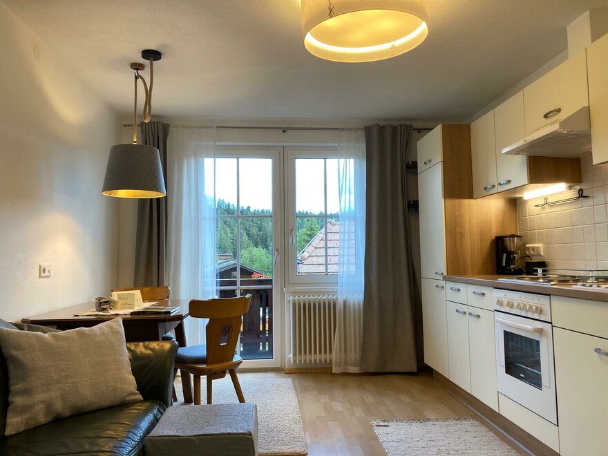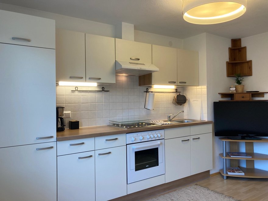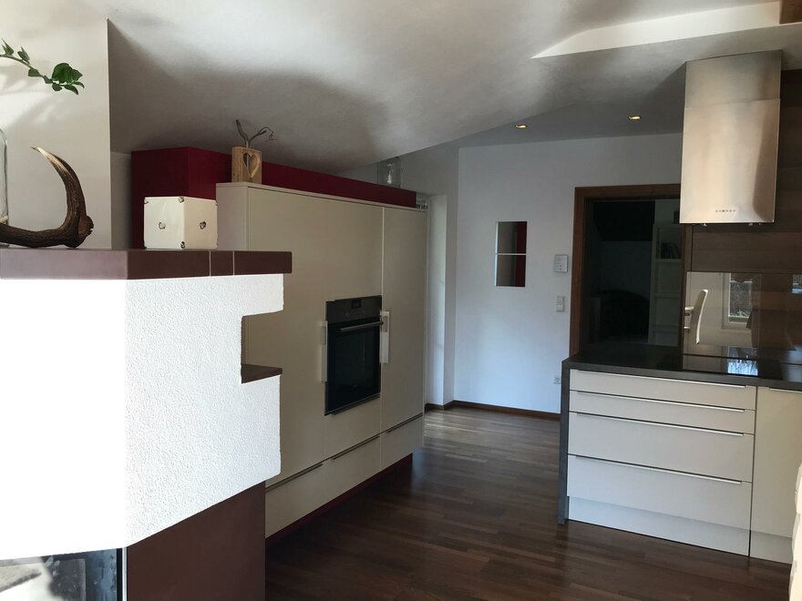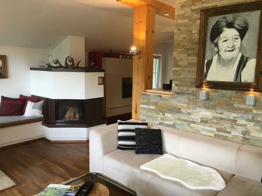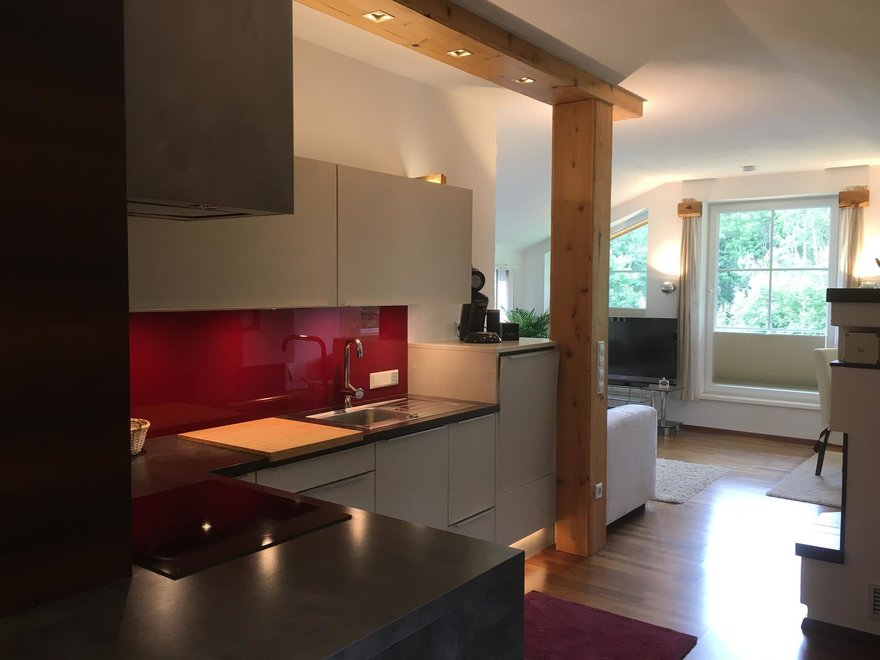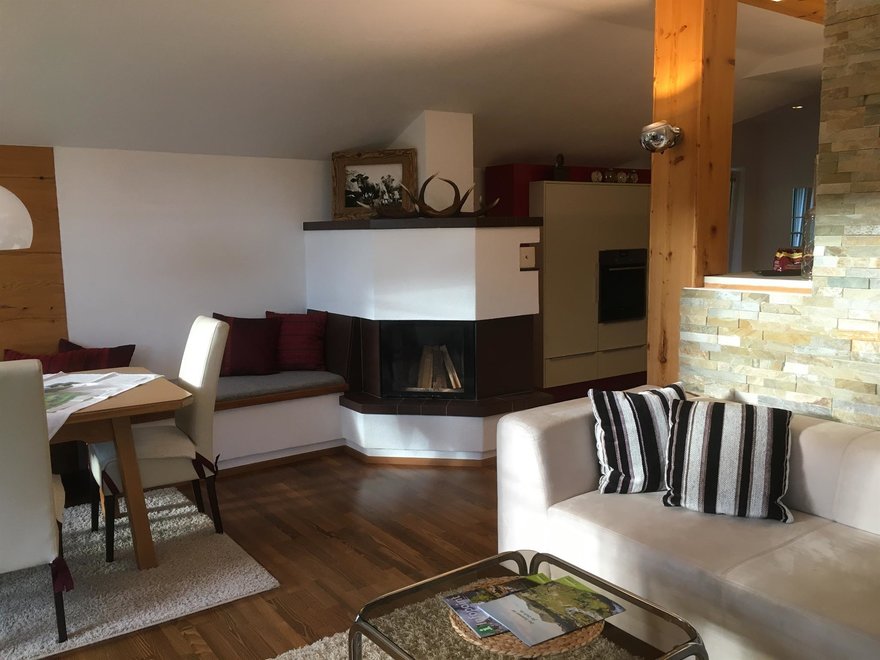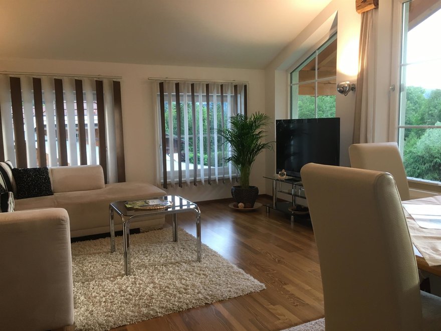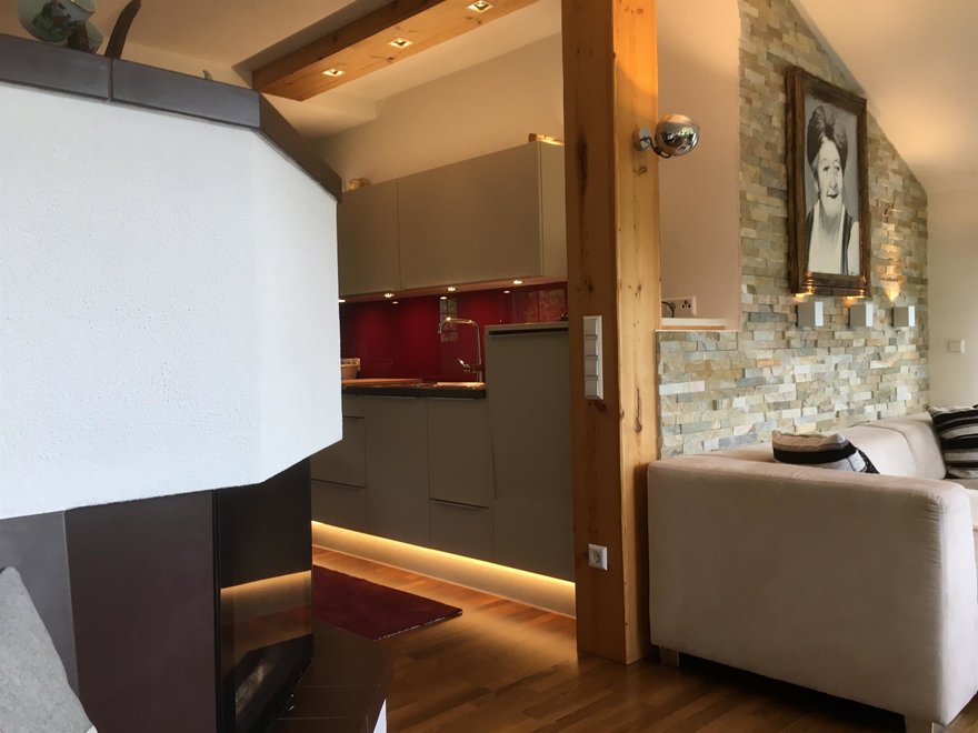 The spacious apartment has 1 bedroom with double bed, 1 comfortable living room (with pull-out couch for 1 person), 1 modern kitchen-living room with dining table, fully equipped with dishwasher, oven, stove, large refrigerator, microwave, etc. and 1 bathroom with shower/WC and dressing room with washing machine. The cosy apartment convinces with its open and bright living room with tiled stove and cosy living area. Large windows allow a wonderful view of the surrounding mountains.