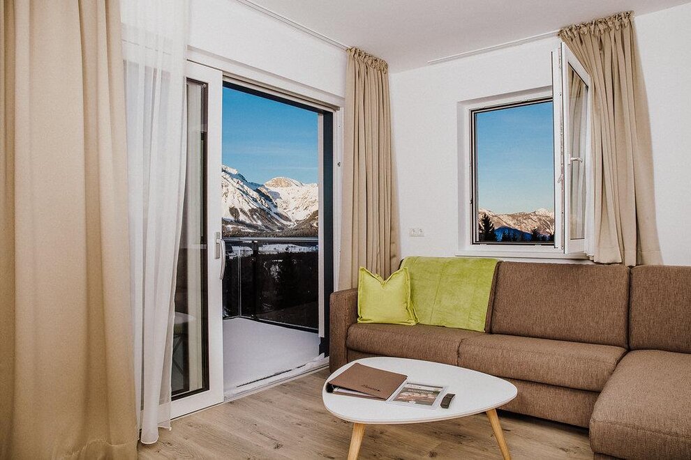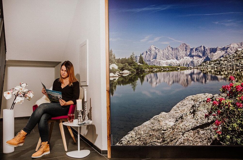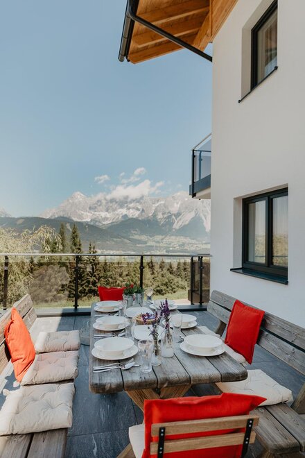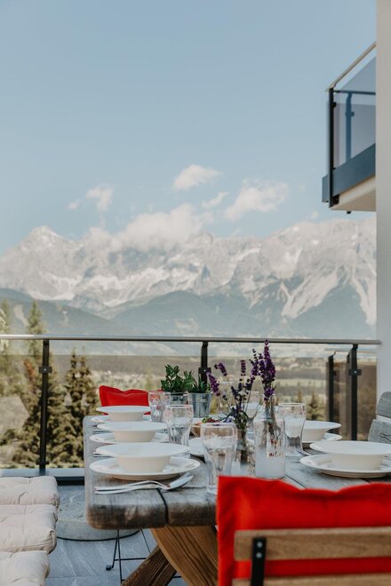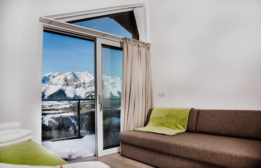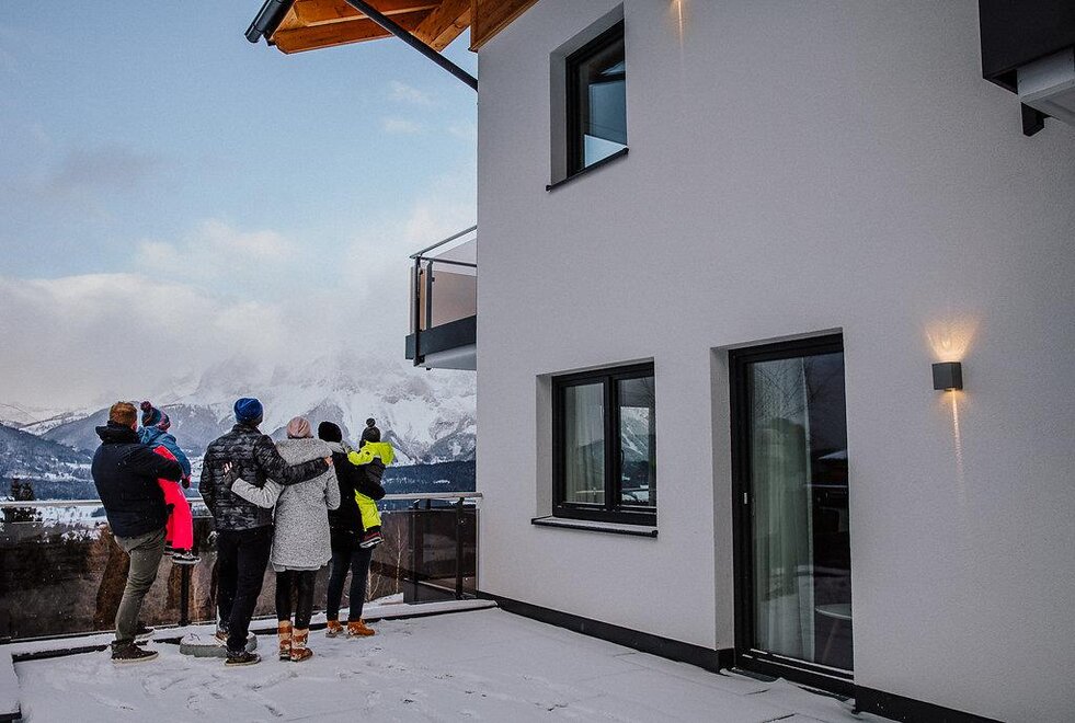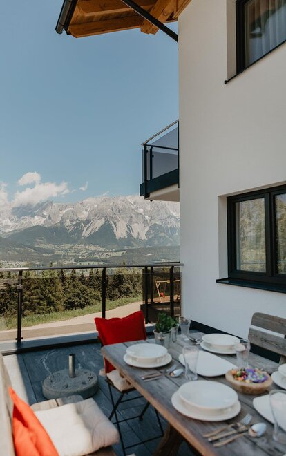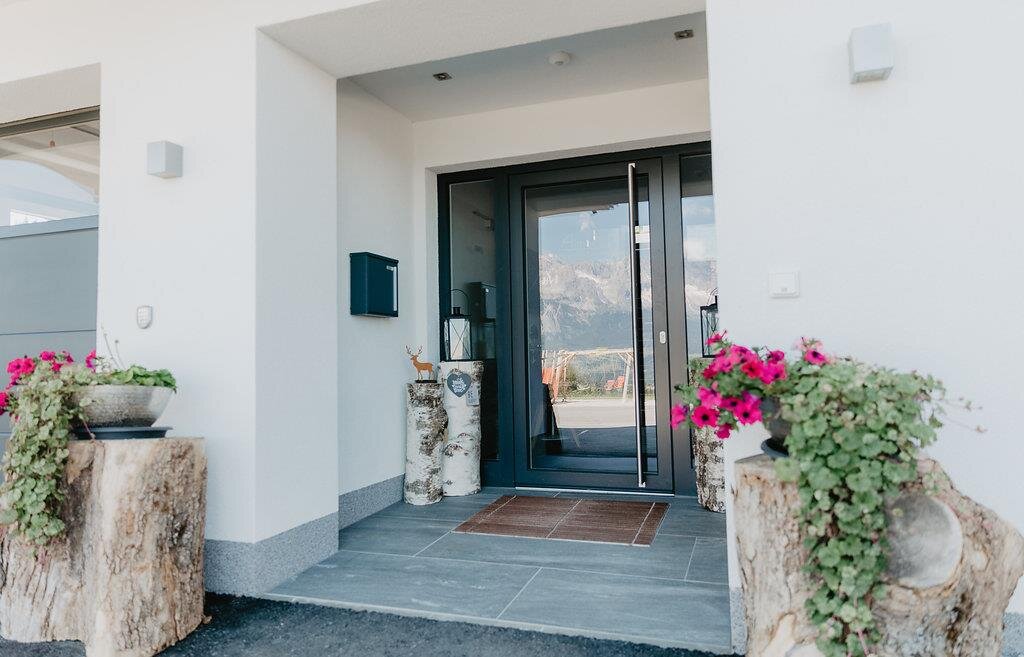 Our apartment house Almnest has modern design with balconies made out of glass and big window fronts, but also traditional with a wooden outside front. All apartments have at 2 balconies or a terrace to enjoy the amazing view of the slopes and the glacier Dachstein. It's very important for me to provide a modern yet still cosy atmosphere in all our apartments.