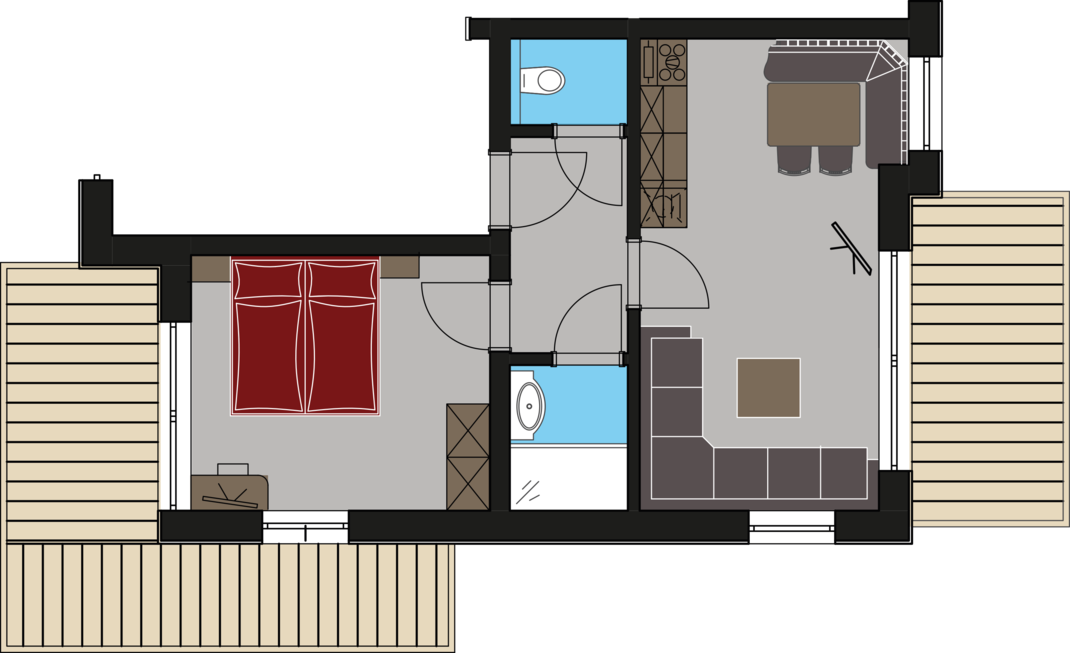 1 Living/Bedroom for 2 people with kitchen, 1 separate bedroom for 2 people, 1 front hall, separate bathroom and toilette, kitchen equipment, microwave, ceran cooktop, refrigerator, dishwasher, coffee machine, kettle, hair dryer, towels, flat TV with radio function, free WiFi and 2 balconies.