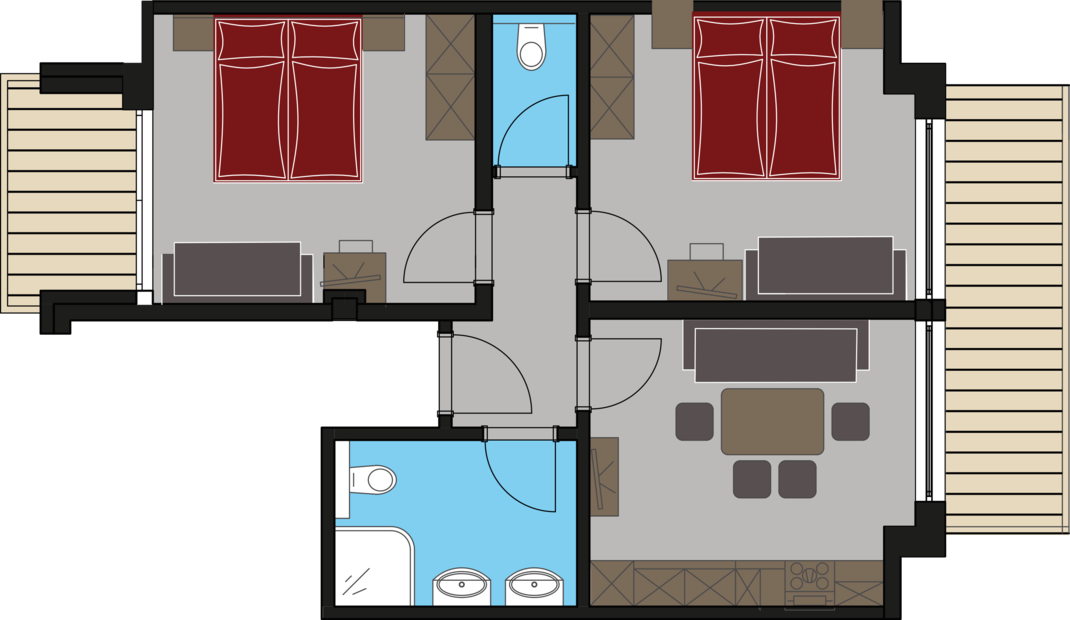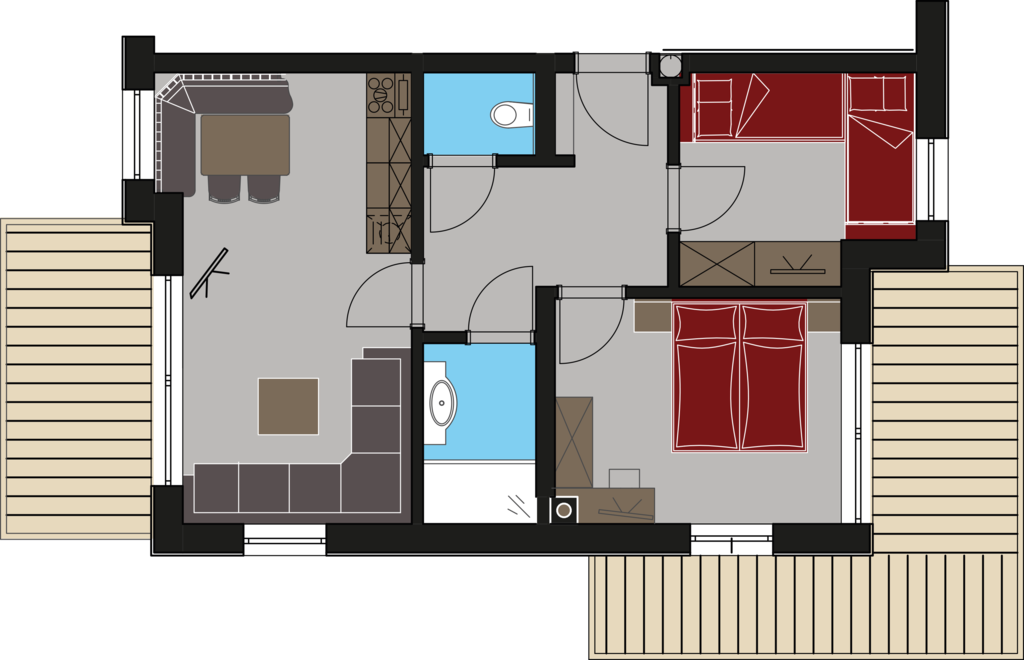 Size 65 m² Occupancy 1 - 6 adults , 0 - 2 children Rooms 3 Bedrooms 2 Room details
