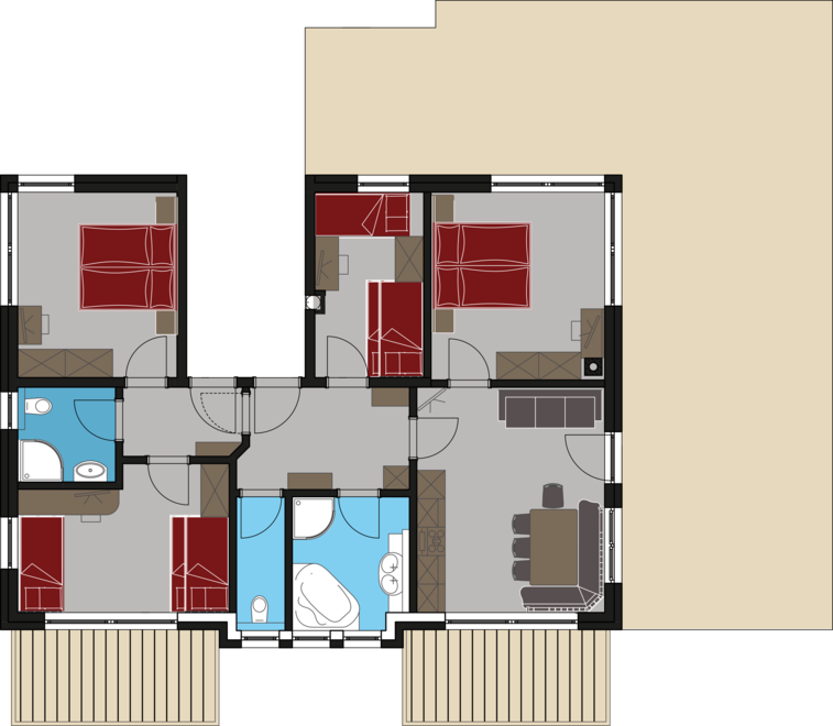 Size 100 m² Occupancy 1 - 10 adults , 0 - 2 children Rooms 5 Bedrooms 4 Room details