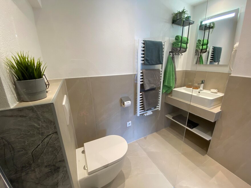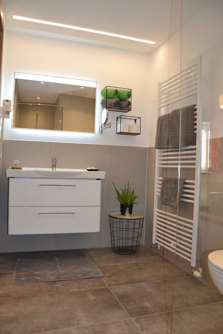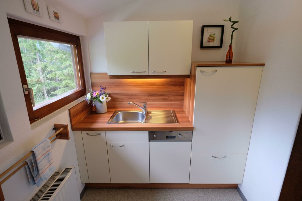 Holiday apartment for 2-4 people, 62 m², 1 bedroom with shower/WC, 1 living sleeping room with shower/WC as well as satellite TV, stereo radio, fully equipped kitchen with dining area, north and south-facing balcony.