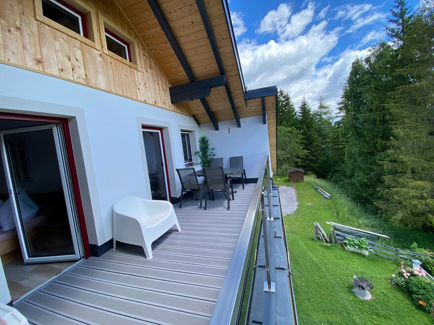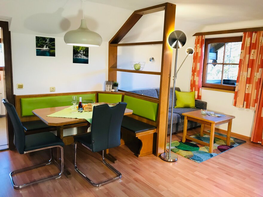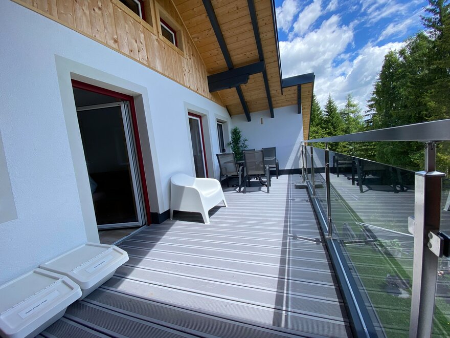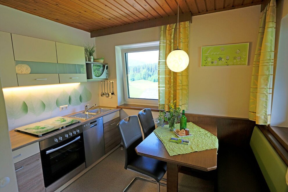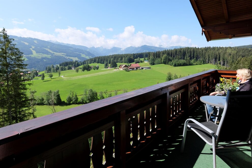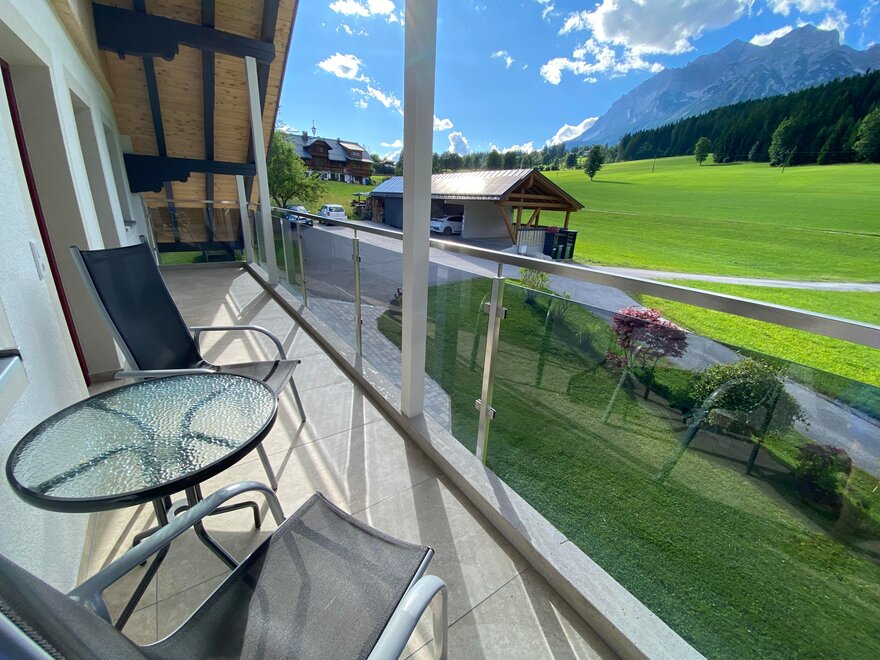 The sunny apartments in our "Haus Alpenblick" are furnished with rustic solid wood furniture. The apartment "Dachstein" is 72 m2, has 2 bathrooms, a fully equipped kitchen including stove top, oven, and dishwasher, as well as a comfortable dining area and a balcony. On the south side of the apartment is a large balcony with a stunning view of the Schladming Tauern mountains.