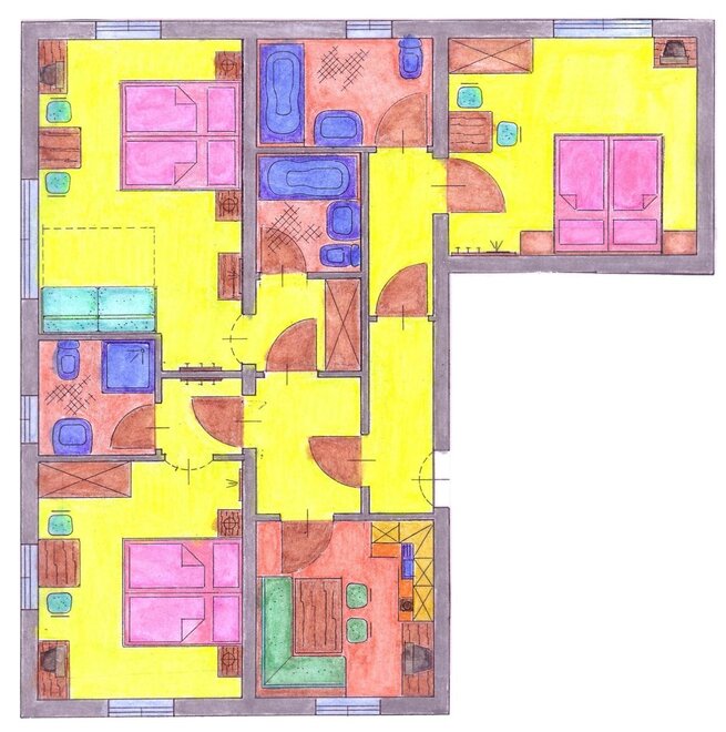 You can choose between 4 apartments sizes. All apartments have a cosy bedroom, a separate bathroom with bathtub and WC or shower, WC. The kitchen-cum-living room is equipped with a comfortable seating area, electric cooker, oven, microwave, dishwasher, coffee machine, crockery and pots and pans.