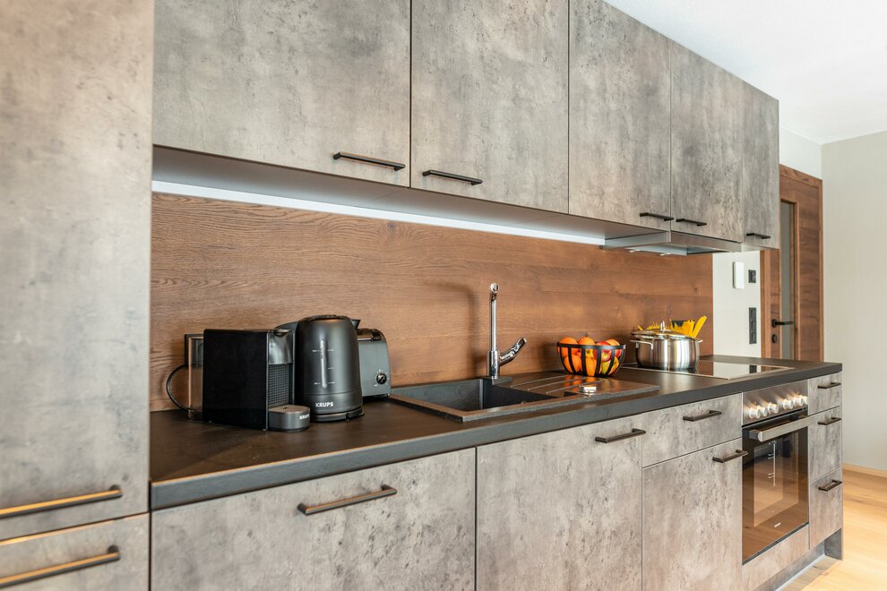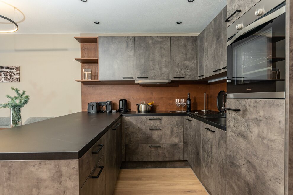 # Kitchen equipped with Nespresso coffee machine (capsule), electric stove, oven, dishwasher, refrigerator, microwave, kettle, toaster