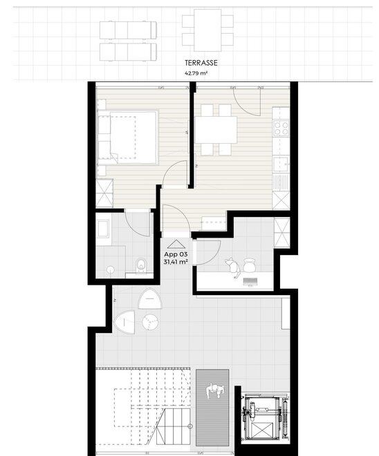 non-smoking room/apt., refrigerators available, no pets allowed, TV, terrace, kettle, family room/apt., coffeemaker, freezer compartment, cooking possibilities, dish sink, furniture suite, garden furniture, microwave, modern furnishing, WiFi, dishwasher, separate bedroom/s: 1, vent hood, separate bedroom/living room, electric stove, good as new room/apt., refrigerator, dishes available, central heating, cable TV, Größe m²: 31, toaster