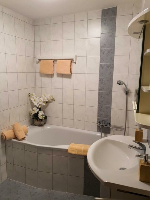 The "Apartment Julius" accommodates up to 6 people, has 2 bedrooms (1x with a double bed, 1x with a bunk bed) as well as a sofa bed for two additional guests. The bathroom includes shower and bathtub, the toilet is separate.
