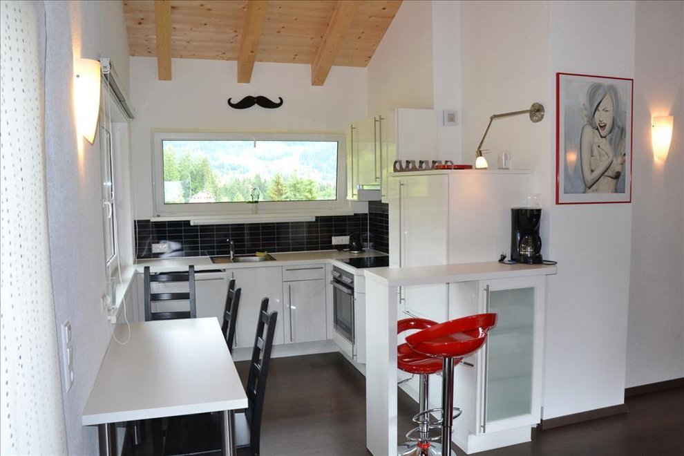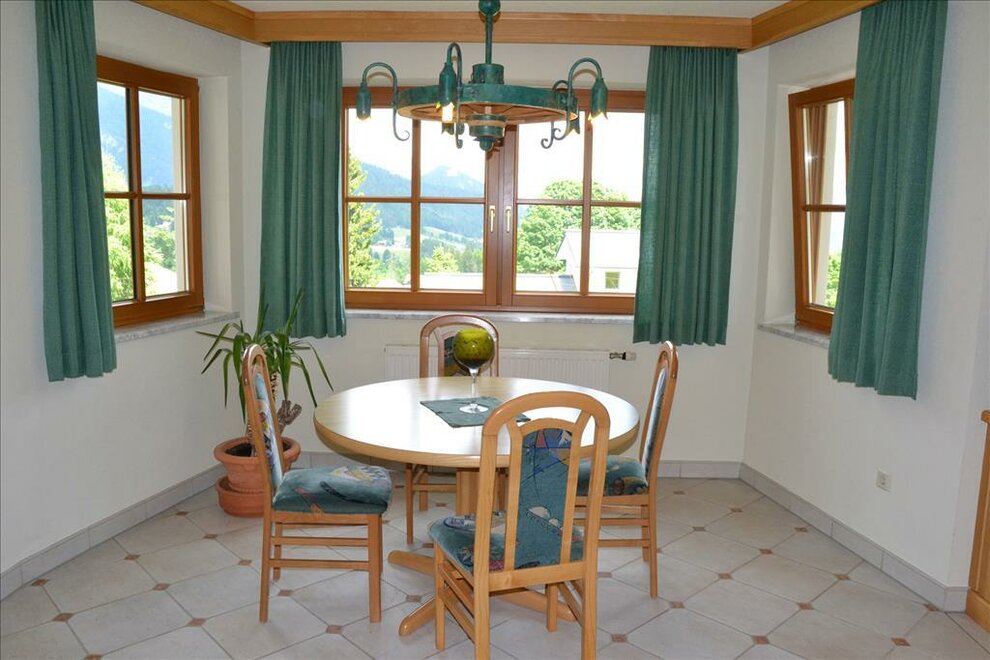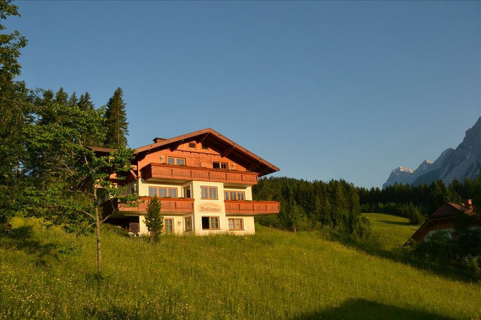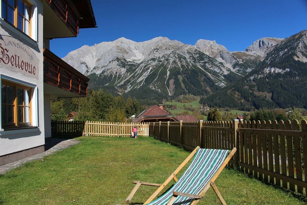 A warm welcome to our Landhaus Bellevue in Ramsau am Dachstein! Our house with 3 large holiday apartments is situated in a quiet location at the edge of the forest but still centrally in Ramsau Kulm. In summer, you find a walking area with a great variety of outdoor activities right on the doorstep: from gentle strolls up to high Alpine Via Ferrata tours at the foot of the Dachstein. The gorgeous winter walking paths as well as the 220 km of cross-country trails can be accessed right at our house. The next grocery, bakery, and restaurants are only 10 minutes away by foot from the Landhaus Bellevue. One of our holiday apartments with 68 m2 is on the ground floor. It has a terrace door to the large fenced garden with 100 m2, making it an ideal place for a holiday with a dog. Walking through the garden door, you have direct access to the close-by forest offering walking paths for extensive strolls with your four-legged friend. On the first floor of our house, you find a holiday flat with room for 2 to 5 persons. This flat has its own balcony with a beautiful view to the majestic Dachstein mountains and to the Ennstal valley. A separate entrance leads you to the third, light-flooded and in a modern way furnished holiday apartment with 58 m2 for 2 persons. From its kitchen window, you enjoy a unique panoramic view to the Dachstein that will fascinate you. The proper large and sunny terrace, with a cosy sitting area and a sun lounger, invites you to relax. All holiday flats consist of a fully equipped eat-in kitchen with a cosy dining corner, one or two bedrooms, a bright bathroom with a shower, and a separate WC. You are welcome to use the ski, boot and mountain bike storage room, the roofed carport for 4 - 5 cars, as well as our free of charge WLan. On demand, you can have fresh breakfast bread rolls delivered to your holiday apartment. The plateau on an altitude of 1100 to 1300 metres above sea level, is a true walking and mountaineering paradise. Besides the Alps’ first Via ferrata and even the longest climbing path, the Super Ferrata, you find numerous secured climbing possibilities in Ramsau am Dachstein. Visit the most beautiful and impressive places of the region with the Schladming Dachstein Summer Card. Infinite fun in the snow! Whether you like Alpine skiing, ski mountaineering, snowshoeing, cross-country skiing, tobogganing, or a romantic walk through the sparkling winter landscape, in Ramsau am Dachstein, everyone finds a relaxing activity to balance their everyday life. We look forward to your visit to the Landhaus Bellevue! Our tip in case you use the satnav for arriving: type in “Eggerwaldweg” as street name, without street number.
