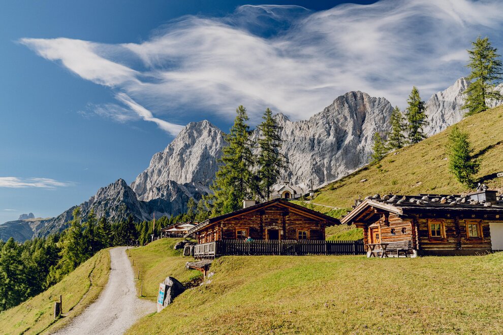 In addition to the idyllic location of the chalets - at the foot of the Dachstein at 1,600 m above sea level amidst gentle alpine meadows - great attention has been paid to the use of local materials such as reclaimed wood and natural stone. The two exclusive mountain chalets offer space for 2-8 people. In the chalets on the mountain, you will feel our rural tradition combined with local materials and modern elements. A cozy living landscape with warm colors, soft loden, and a love for detail merge here into a special kind of well-being. Find peace and let your thoughts roam free; you can do this in our chalets on the mountain thanks to the necessary tranquility. Let yourself be enchanted by beautiful sunrises and sunsets in absolute serenity on the large terrace amidst magnificent natural landscapes.