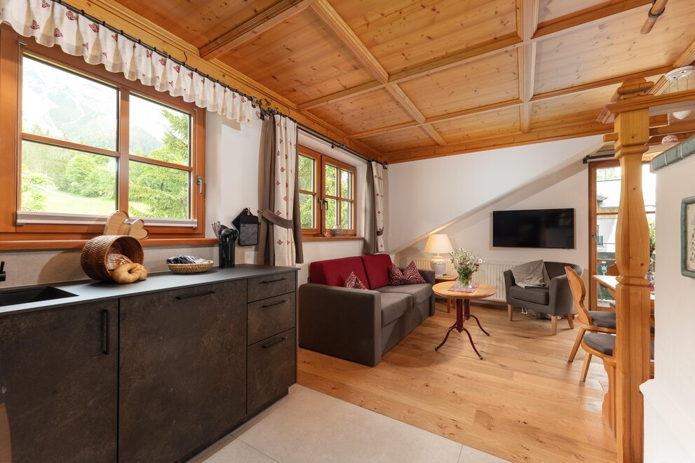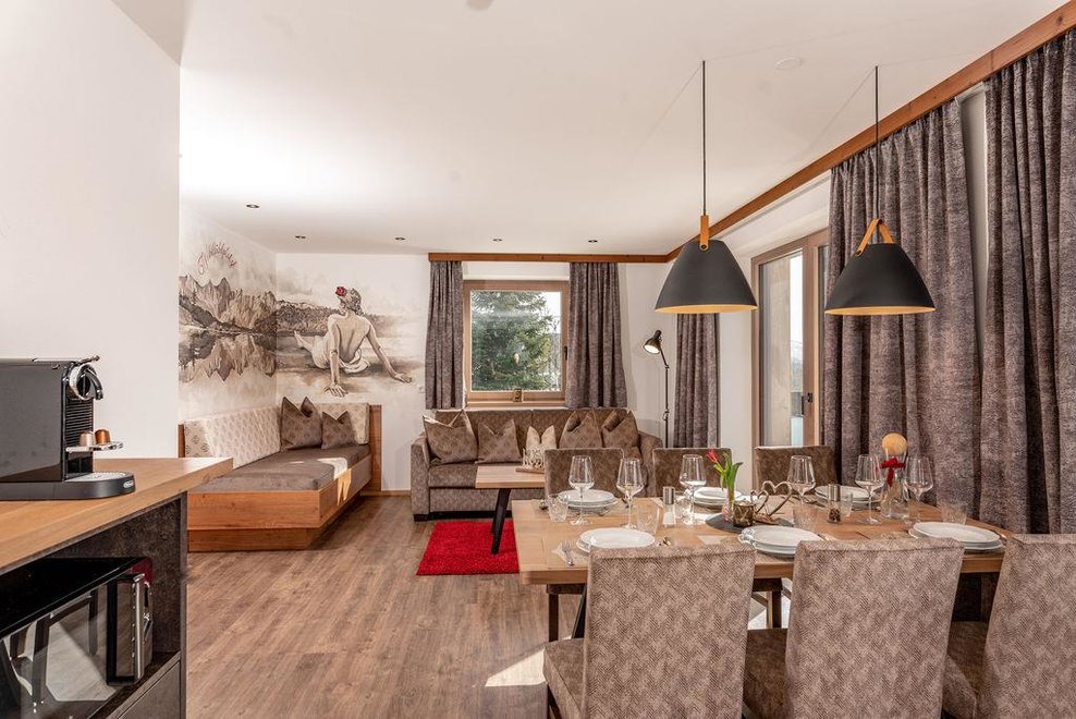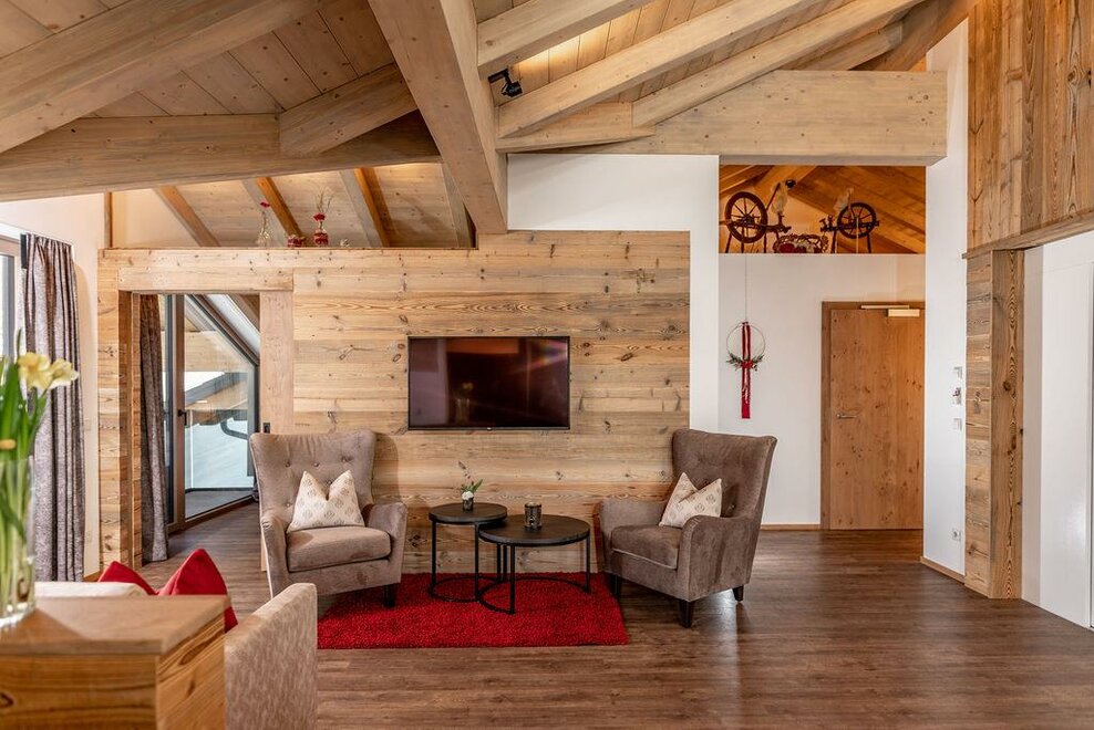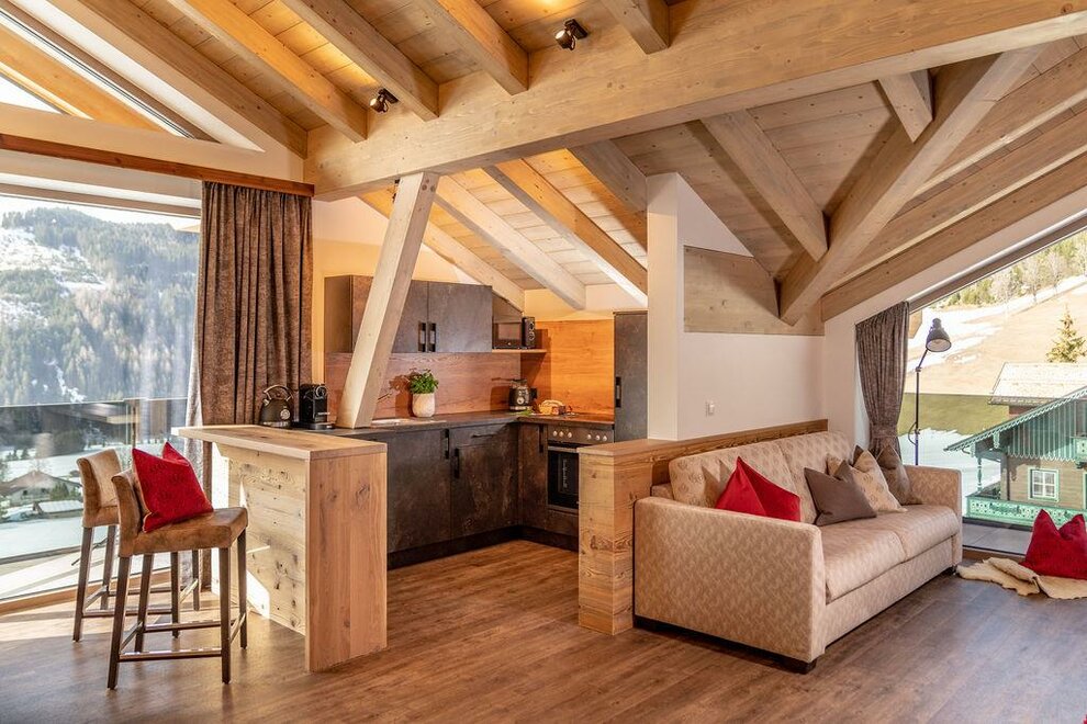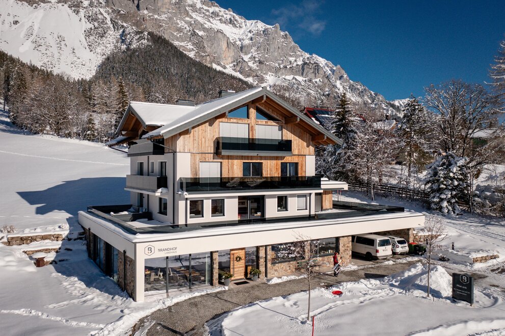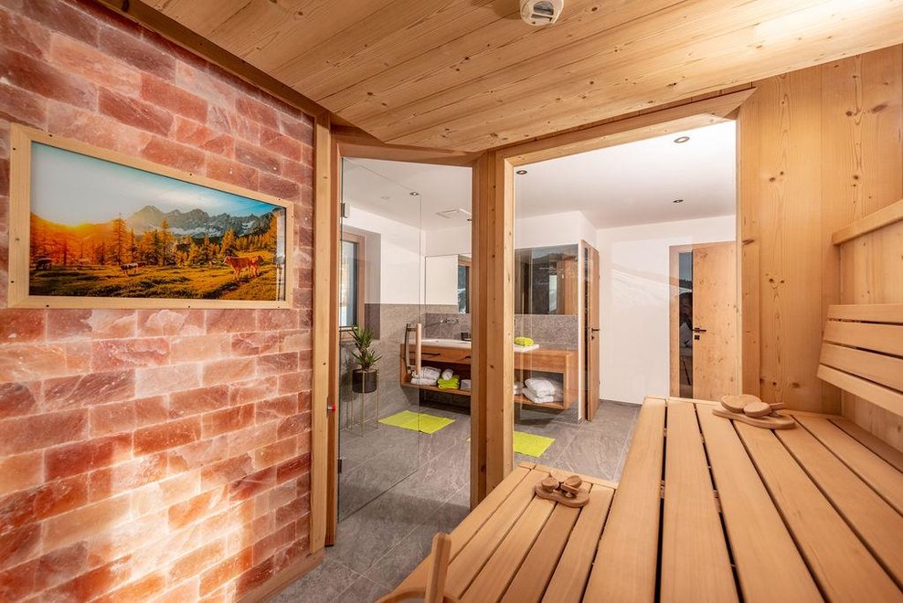 Apartment Lieblingsplatzl: Tradition meets luxury. Ideal for families or 2 couples.The built-up attic and penthouse in the Brandhof Landhaus stands out with its brightly lit visible roof chair, large window fronts with unique panoramic views and light-flooded open rooms. An exclusive room offer of 2 bedrooms, 2 bathrooms with 2 toilets, a high quality equipped kitchen in the middle of the apartment with open dining area and cozy living room promise an unforgettable break in the mountains. The Finnish sauna overlooking the Dachstein Mountains and the Schladminger Tauern is an exclusive custom made made from local wood. The exclusivity is rounded off by the elevator in the middle of the apartment.