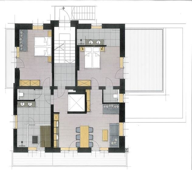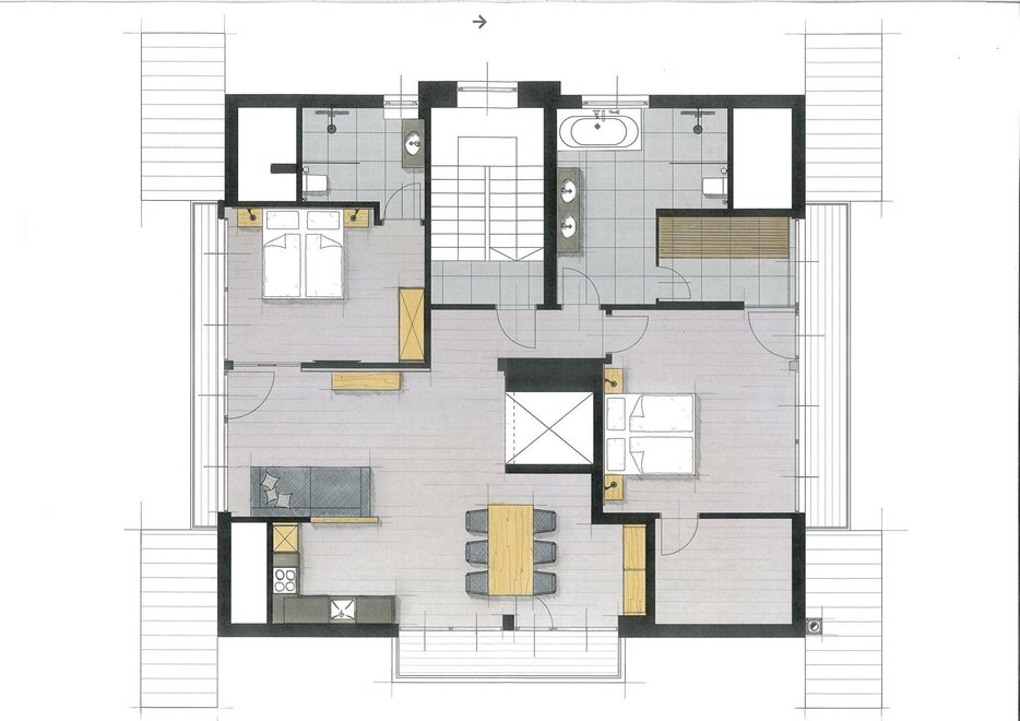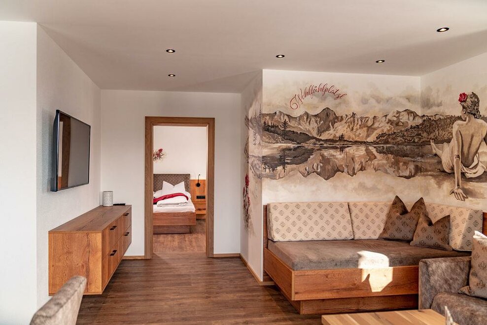 Apartment Wohlfühlplatzl: Tradition meets luxury. Ideal for 2 families or 2 couples.Where luxury is certainly not neglected. In the 2nd. On the first floor the generous luxury apartment stands out and promises a generous as well as exclusive space offer of 2 bedrooms, 2 bathrooms, 2 separate WC, anteroom. The well thought-out kitchen in the middle of the apartment is comfortably open to the living room.