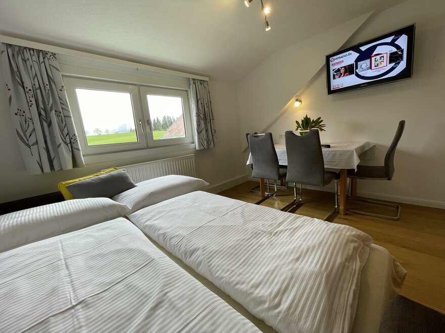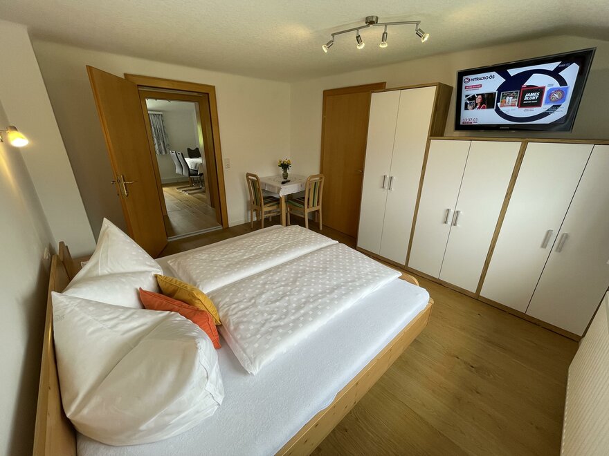 Appartement 2 mit 56 m2 mit zwei Schlafzimmern, einer gemütlichen Wohnküche mit Schlafcouch bietet Platz für 4 bis 6 Gäste und verfügt ebenso über einen Balkon. Das Appartement verfügt über ein Badezimmer mit Dusche, WC und Balkon. Bettwäsche und Handtücher sind vorhanden.