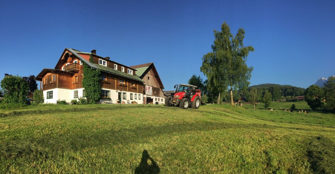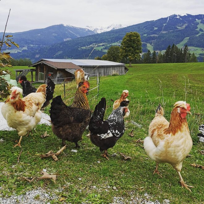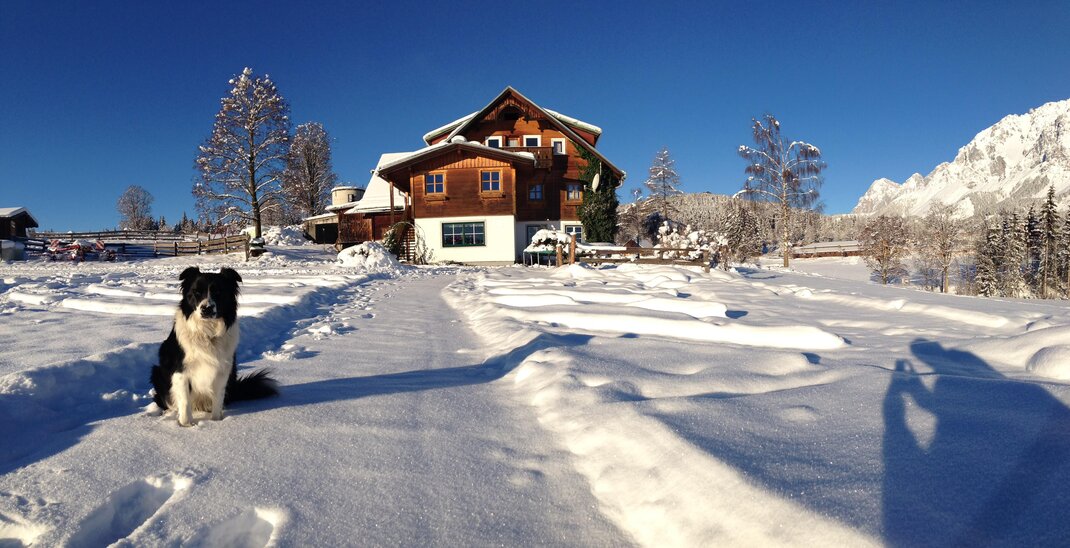 Amid the dream-like mountain scenery and pristine nature an extraordinary adventure awaits you at any time of the year in Ramsau on the Dachstein. Our privately owned and family-friendly Burglehner farm is located in a quiet, idyllic spot and offers a lovely panoramic view of the Southern Dachstein massif. We want to do our very best to make every moment of your stay at the Burglehner farm unforgettable and pleasant! Our guests enjoy the tranquillity to be found at 1000 metres above sea level. The Burglehner farm is also an ideal starting point for hikes and skiing trips. You can start your hike right outside the door of the farm and leave your car parked. The Burglehner farm is particularly popular among for cross-country skiers. A 12-kilometre long cross-country course passes the house. Our comfortable and cosy double rooms have a shower, toilet and satellite TV. There is one double room with a balcony. The breakfast buffet offers a large selection of regional specialities, and we serve milk from our own farm. Furthermore, we offer our guests a refrigerator, WLAN and a ski storage room equipped with a heater for your ski boots. For get-togethers we suggest our snuggery with a tile stove. Cows, cats, rabbits, ducks, ponies, calves and a friendly dog make the Burglehner farm in Ramsau a paradise for families. A leisure room with table football and a playground with table tennis, swings, go-karts, a trampoline and supervised pony riding guarantee fun and lots of excitement. The neighbouring farm offers horseback-riding tours for you to explore the surroundings of the village that boasts the most horses in all of Austria. In winter the Burglehner farm is the ideal starting point for skiing and cross-country skiing trips of all kinds. The family-friendly skiing region Ramsau with Kali’s adventure pistes and the skiing region Amadé including Planai, Hauser Kaibling, Hochwurzen and Reiteralm are within reach, a mere 15-minute drive away. All those looking for fun in the snow all year round will feel comfortable on the glaciers of the Dachstein, which is only 12 kilometres away. We are looking forward to welcoming you soon at our Burglehner farm in Ramsau on the Dachstein! Yours truly, Family Siedler