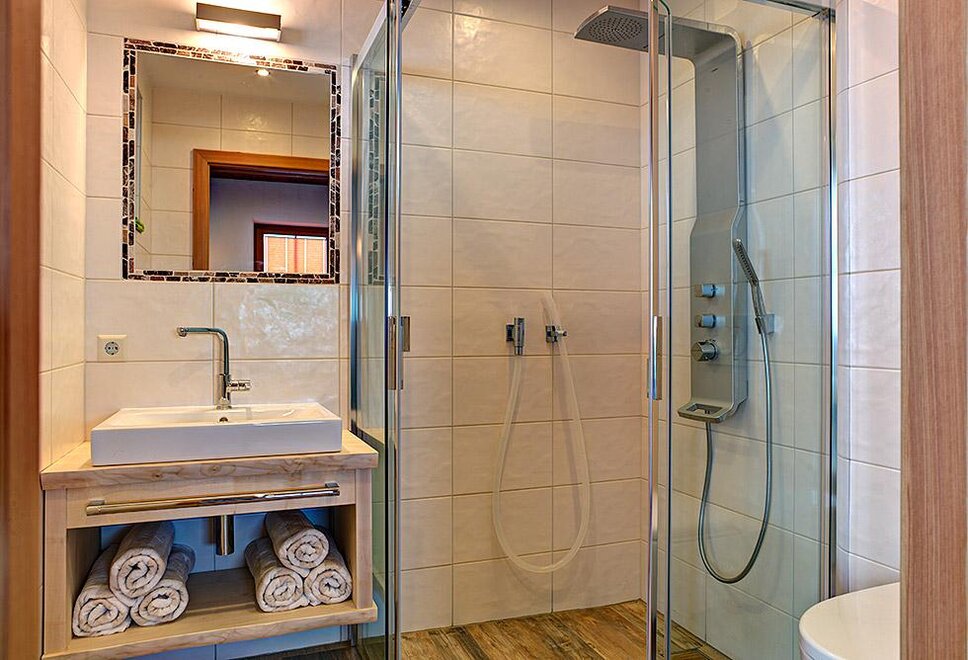 Continuing up the staircase to the sleeping area which comprises: one double room with TV (Sat TV) and with access to the balcony, one further double room with TV (Sat TV), ensuite bathroom (shower and WC). In this room there is also an access to the balcony. The third bedroom has one single bed and one bunk bed and therefore it is suited as a children’s room. On this floor can be found a further bathroom with shower and WC.