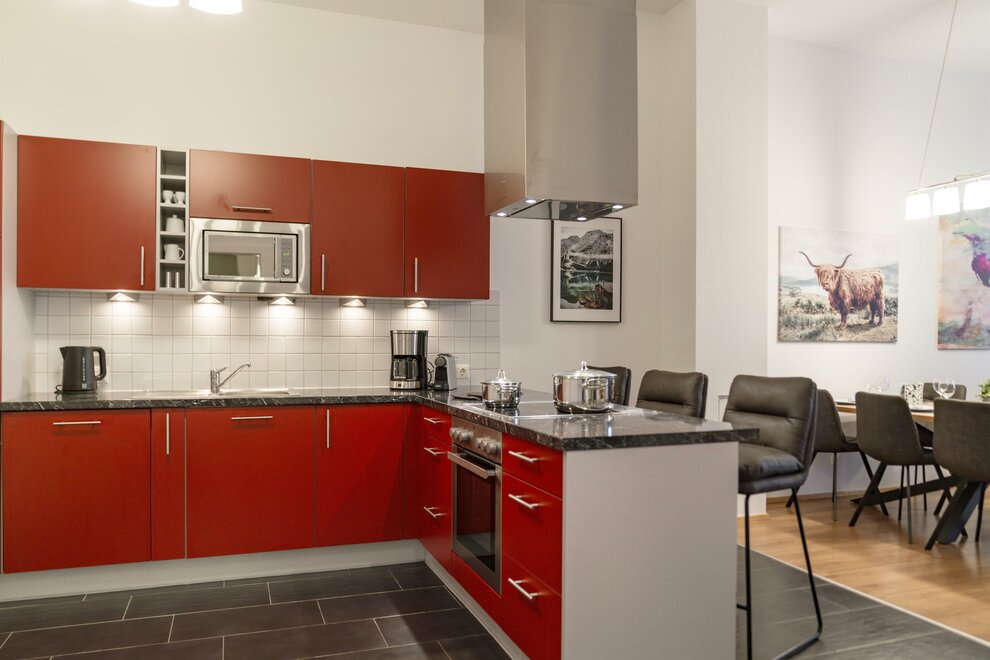 1 eat-in kitchen with a large dining area and a well-equipped kitchen with a filter coffee machine, electric stove, oven, microwave, refrigerator