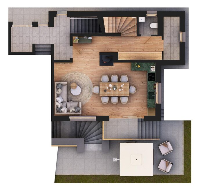 WiFi, room/apt. (non-allergic), garden barbecue, central heating, terrace, fire extinguisher, heater, garden, balcony, iron, Swedish fireplace, coffeemaker, hairdryer, refrigerators available, dish sink, toiletries, electric stove, garden furniture, socket close to bed, dishes available, dryer, separate bedroom/s: 3, bed linen available, private entry, furniture suite, towels available, kitchen utensils, oven, TV, kitchen, use of washmachine, essentials (towels, bed linen, soap, toilet tissue), toaster, Größe m²: 120, freezer compartment, radio, open plan kitchen/living room, anteroom, bed linen (non-allergenic), microwave, no pets allowed, high chair, washing machine, modern furnishing, store room, separate bedroom/living room, sauna, wooden or parquet floor, cable TV, tiled or marmor floor, wood oven, refrigerator, dishwasher