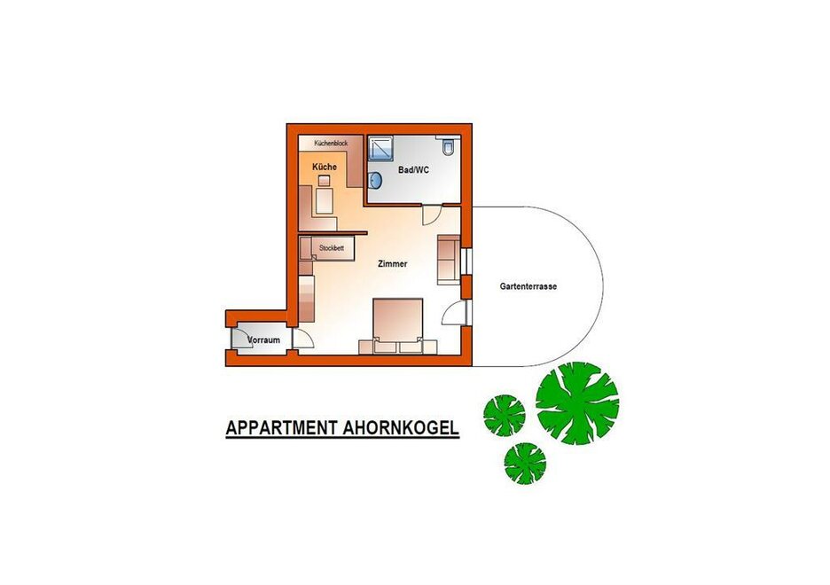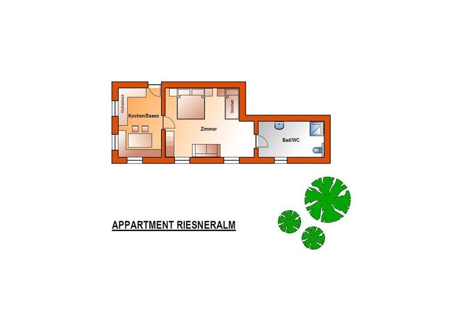 The apartment Riesneralm, has its own terrace and consists of a cozy kitchen (fully equipped), a bedroom with a double and a bunk bed and a couch, that includes a barrier-free bathroom.