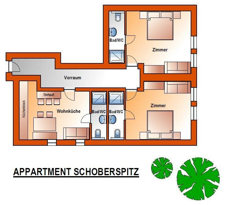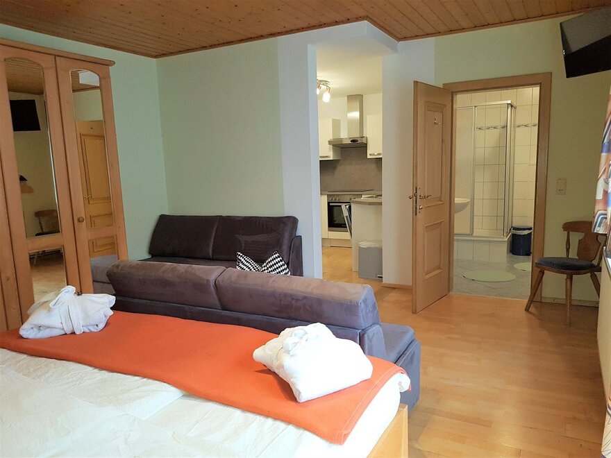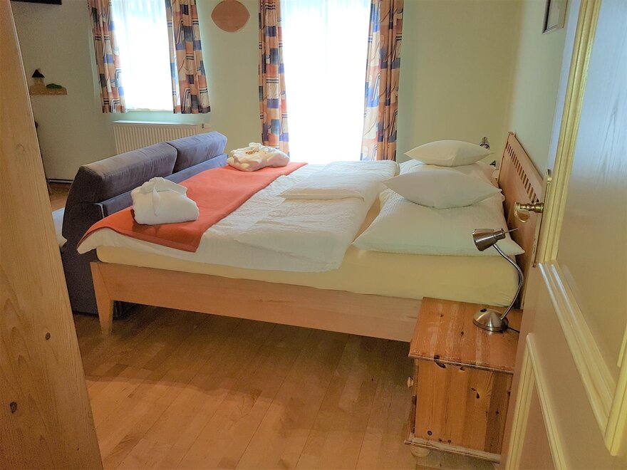 The apartment Schober Spitz, located on the 2nd floor, is our largest apartment, it offers 2 bedrooms each with a private bathroom and a cozy large kitchen - fully equipped - with a couch and also a private bathroom.
