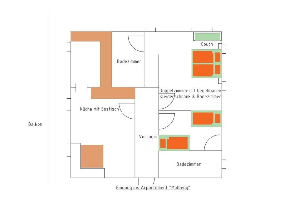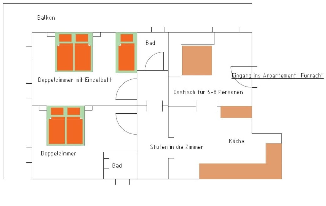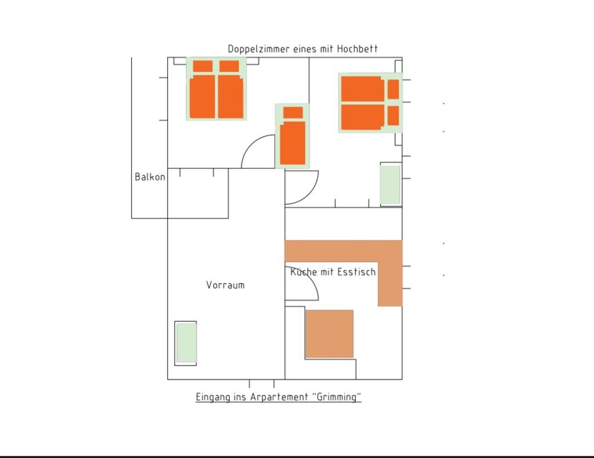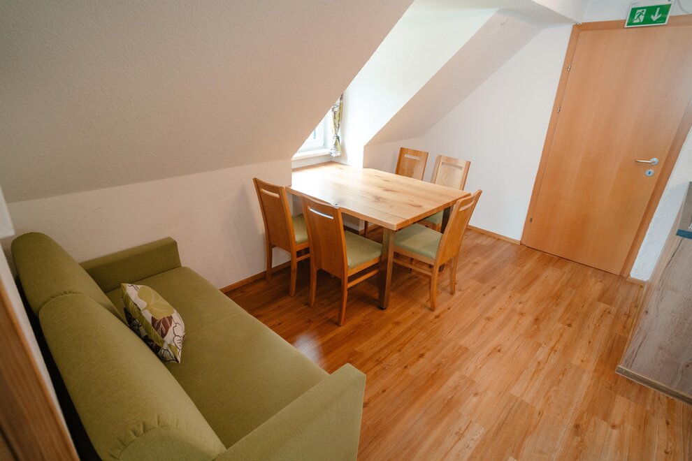 Our apartment "Donnersbach" for up to 6 people is equipped with 2 separate bedrooms (Bedroom No. 1 with double bed, Bedroom No. 2 with bunk bed and double bed), a living-dining kitchen, shower, 2 toilets, and 2 televisions.