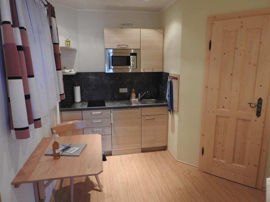 Kitchenette with induction stove, oven, fridge, coffee maker, various small appliances (such as toaster, kettle, etc.), dishwasher, and complete dishware.Room/apartment features