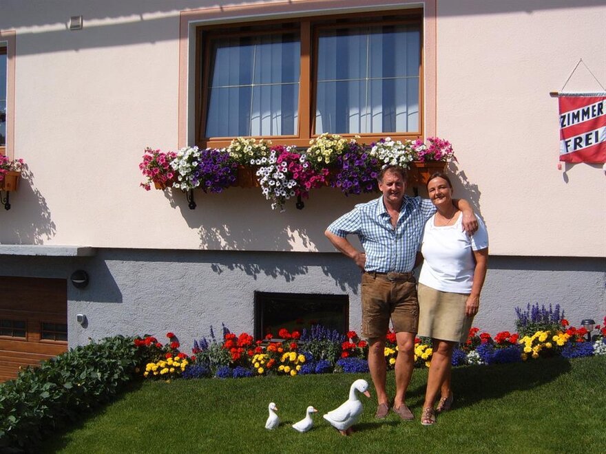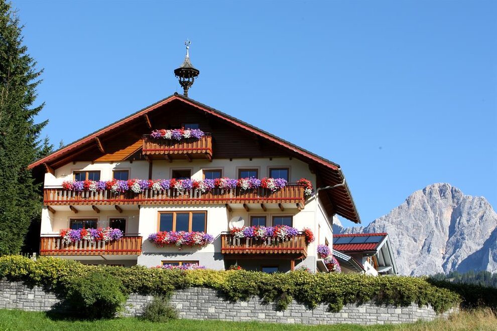 High up on the Ramsau am Dachstein plateau, at an altitude of 1,150 m, is our home, Haus Felsenheim, in one of the sunniest spots of the Schladming-Dachstein region. Haus Felsenheim lies quietly on the outskirts of the forest in Ramsau Vorberg. The bus stop for the free ski bus to the ski amadé area, to the Ramsau ski region, with Kali’s adventure ski-runs, and to the Alp’s easternmost glacier at the Hoher Dachstein, is only 100 metres away from the house, and just a 20-minute walk or five-minute drive, you get to the centre of Ramsau am Dachstein, the family-friendly, popular holiday resort, where you’ll find supermarkets, a museum, a public indoor pool, and the ski jump. Experience Styrian hospitality at the nearby restaurants. In the mornings, we welcome you with a rich breakfast buffet, so look forward to crusty bread rolls and brown bread fresh from the local bakery, aromatic coffee, tea, or hot chocolate, a savoury cold cuts and cheese platter, several kinds of jam and cereals, as well as a fresh seasonal fruit salad. Well fortified, you can head out from our non-smoking house on a day full of adventure, knowing you can store your kit at our ski depot and dry your boots in our driers when you return. The double rooms at Haus Felsenheim are furnished with solid wood and decorated with friendly colours. They have Sat TV, shower and WC, a small sitting corner, as well as an ample balcony, which invites you to sunbathe and relax in summer. Free Wi-Fi is available in the entire house. You can also book a holiday flat with panoramic views and a living-sleeping room, separate kitchen, bathroom with shower and WC, and a south-facing balcony. In summer, Ramsau am Dachstein is the ideal starting point for impressive hikes and climbing and biking tours in the mountains of the Dachstein massif and the Schladming Tauern. Enjoy some top-class leisure entertainment! At nearby Rittisberg, you find various attractions such as a fairytale trail and a barefoot path, a high-ropes adventure park, a summer tobogganing run, archery, and much more. After a day filled with activities in Ramsau am Dachstein, you might like to enjoy some time off in our garden, where you will definitely find the perfect spot to unwind and relax. In winter, you can access the Ramsau World Championship-level 220 km network of cross-country trails right from the house. During a romantic horse-drawn sleigh ride along the Ramsau winter walking paths, you might want to stop by one of the cosy huts, where you will fall for the distinctive Ramsau alpine huts’ flair and will be pleased to come back again. We, Erika and Gerhard Landl, would be more than happy to look after you at our guesthouse.
