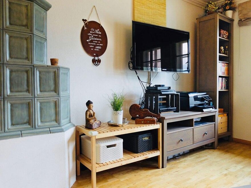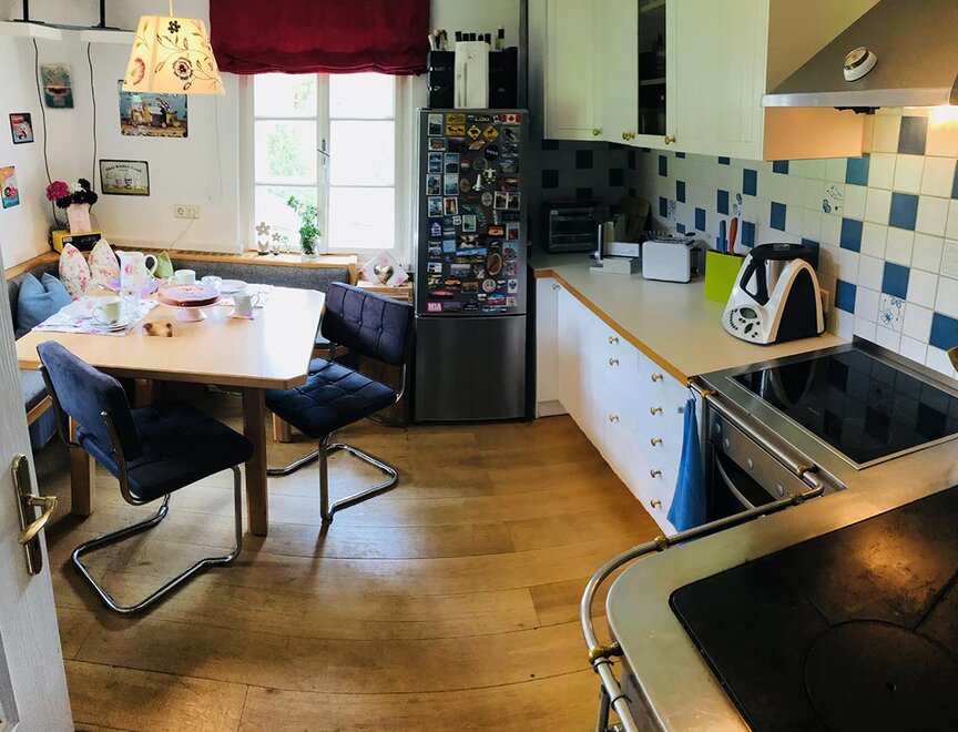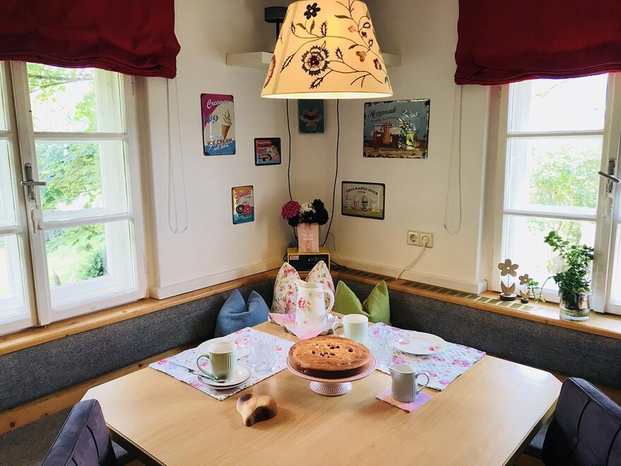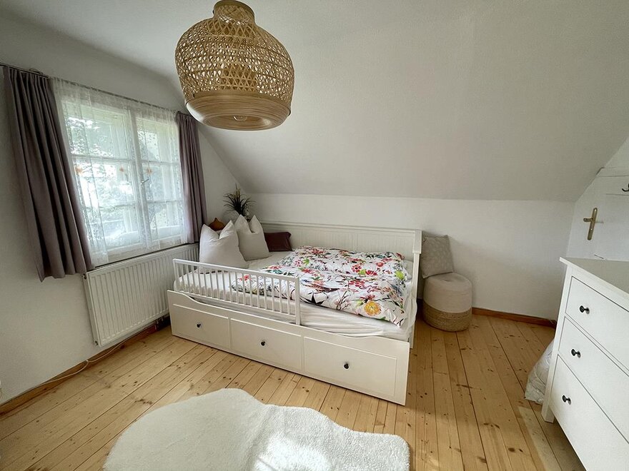 Idyllic vacation home with fully equipped kitchen, living room (large couch, tiled stove, TV system with Apple TV, DVD player, Bose sound system, radio), one bedroom with double bed as well as a children's room with single or double bed (baby equipment available upon request) and bathroom (shower, toilet, hairdryer, and straightener). Garden with barbecue, sun loungers, seating area, parasol, sandbox & wooden stove sauna. Free Wi-Fi!