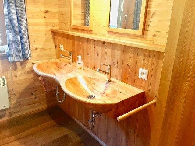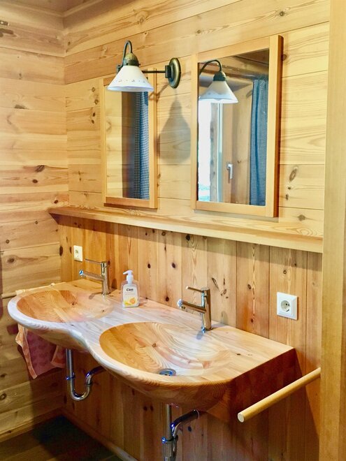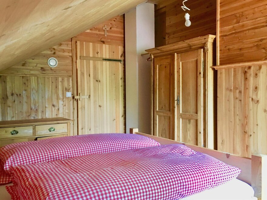 Wonderful rooms with cabin charm, four bedrooms on the upper floor, each for two people, 4 single beds, one double bed is 140 cm wide, the other 160 cm, one bedroom on the ground floor for one person, spacious living kitchen