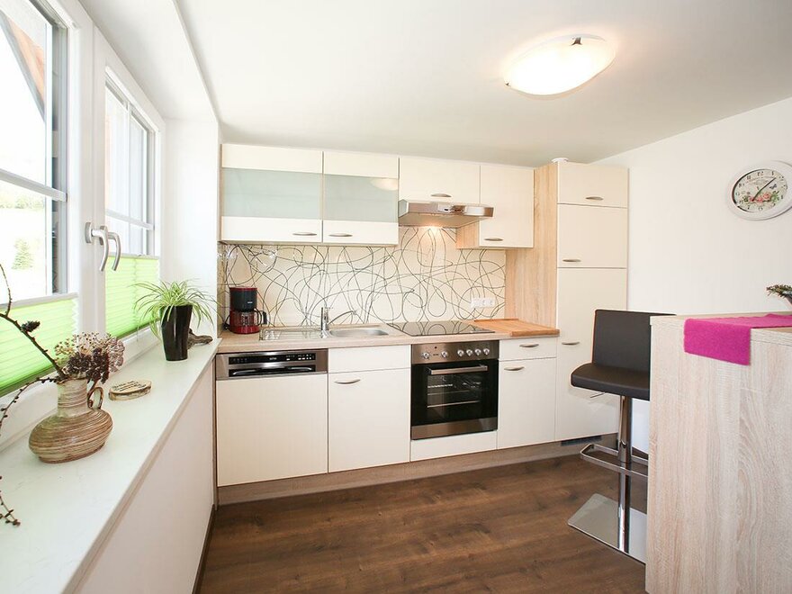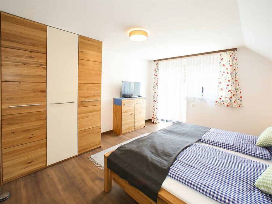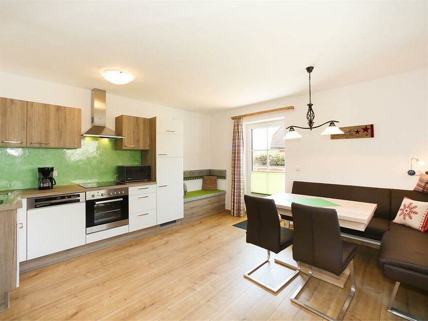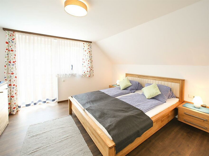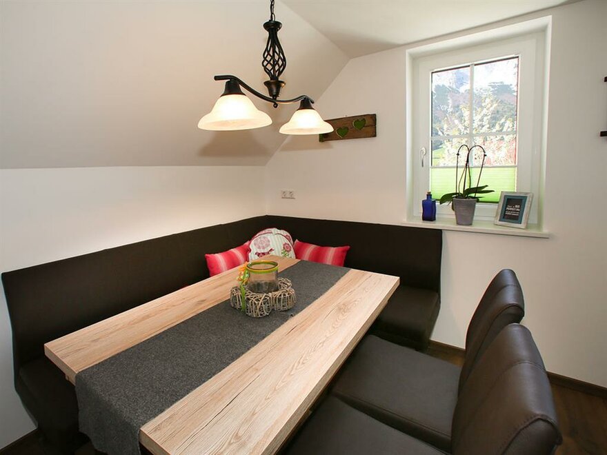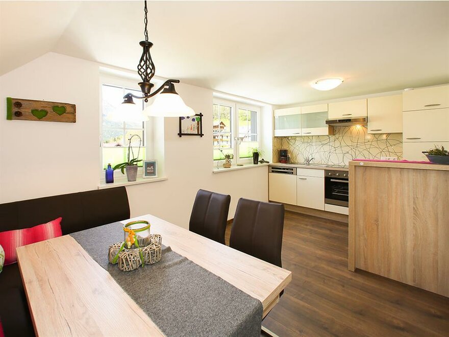 The flat has two bedrooms, a spacious kitchen with seating area, a bathroom with shower and WC. The kitchen is equipped with a kitchenette, a cosy bar area for a quick breakfast, a seating area and an additional sofa. The flat is also equipped with W-Lan Internet and flat screen TVs. Enjoy the view of the Grimming from the flat. A small balcony faces south-west. Kitchen equipment: electric cooker, oven, fridge, dishwasher, microwave, coffee machine, kettle, pots and pans, crockery and tea towels