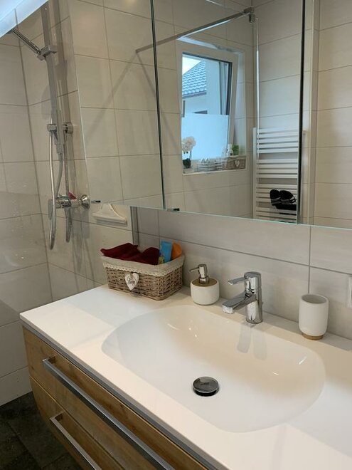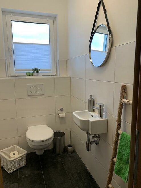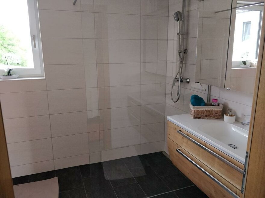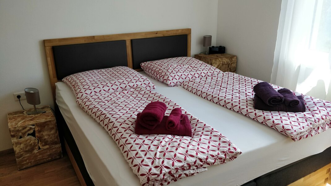 Our non smoking apartment on the first floor has a fully equipped kitchen, 2 separate bedrooms, bathroom with shower, separate toilet and a large living room with a covered terrace of approx. 14 m².