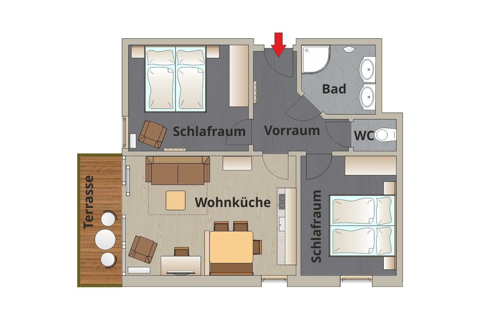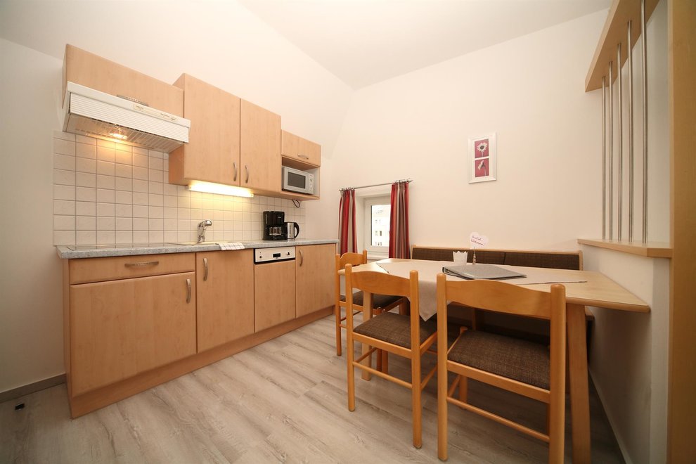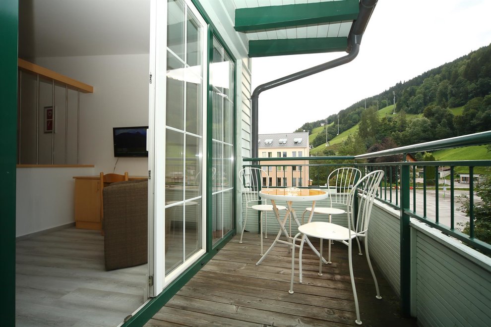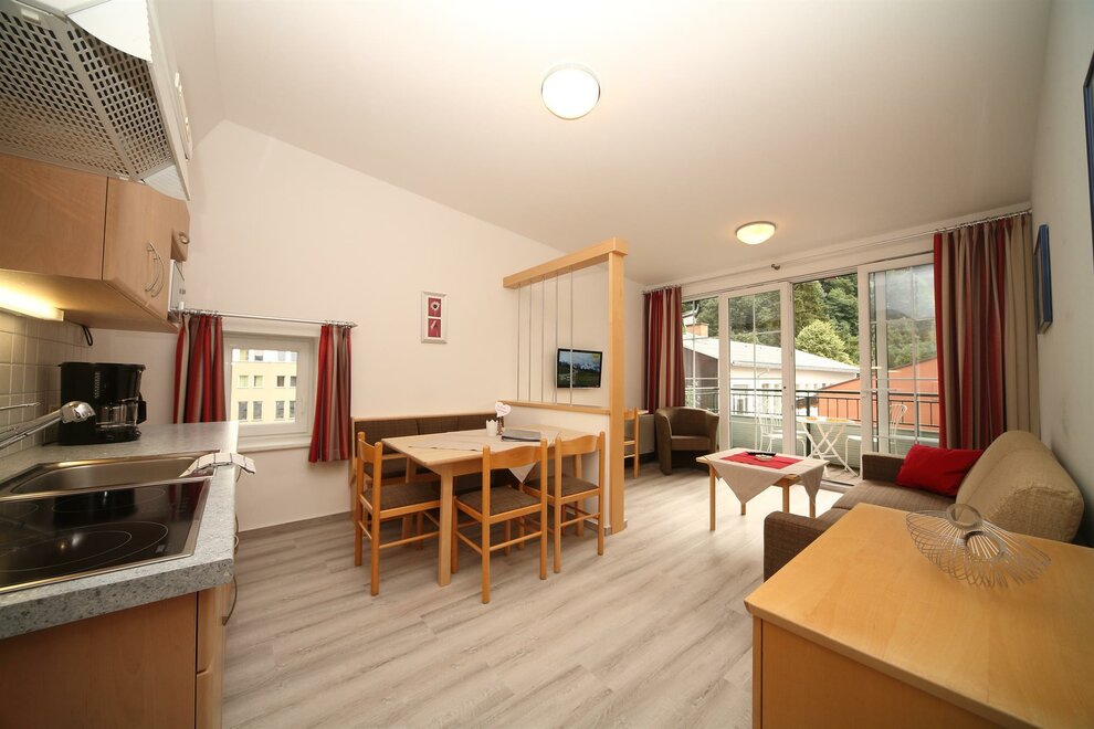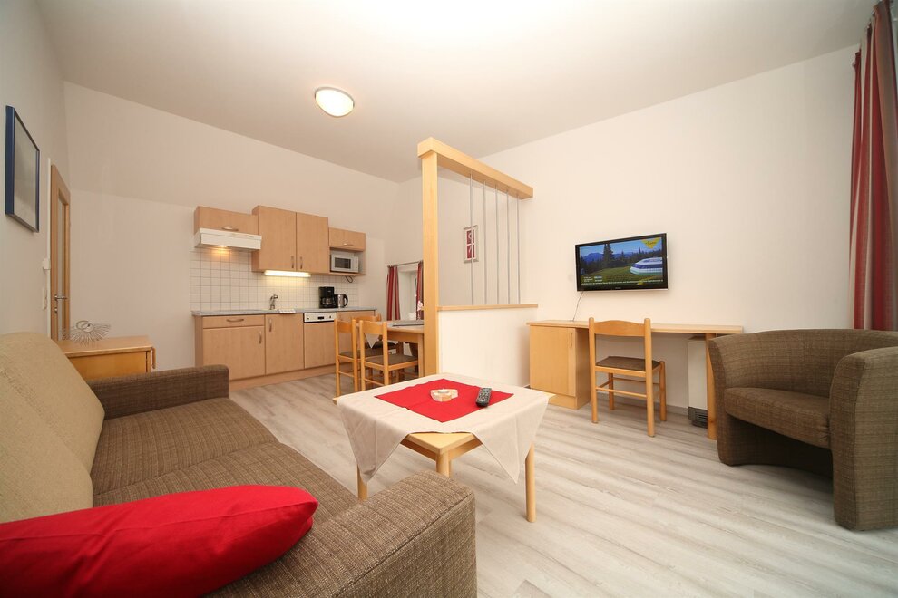 Enjoy your holiday in Schladming in our 56 m² apartment consisting of an entrance hall with graderobe, a kitchen with dining table and pull-out sofa, two bedrooms, a bathroom with shower, a toilet and a south-facing terrace.